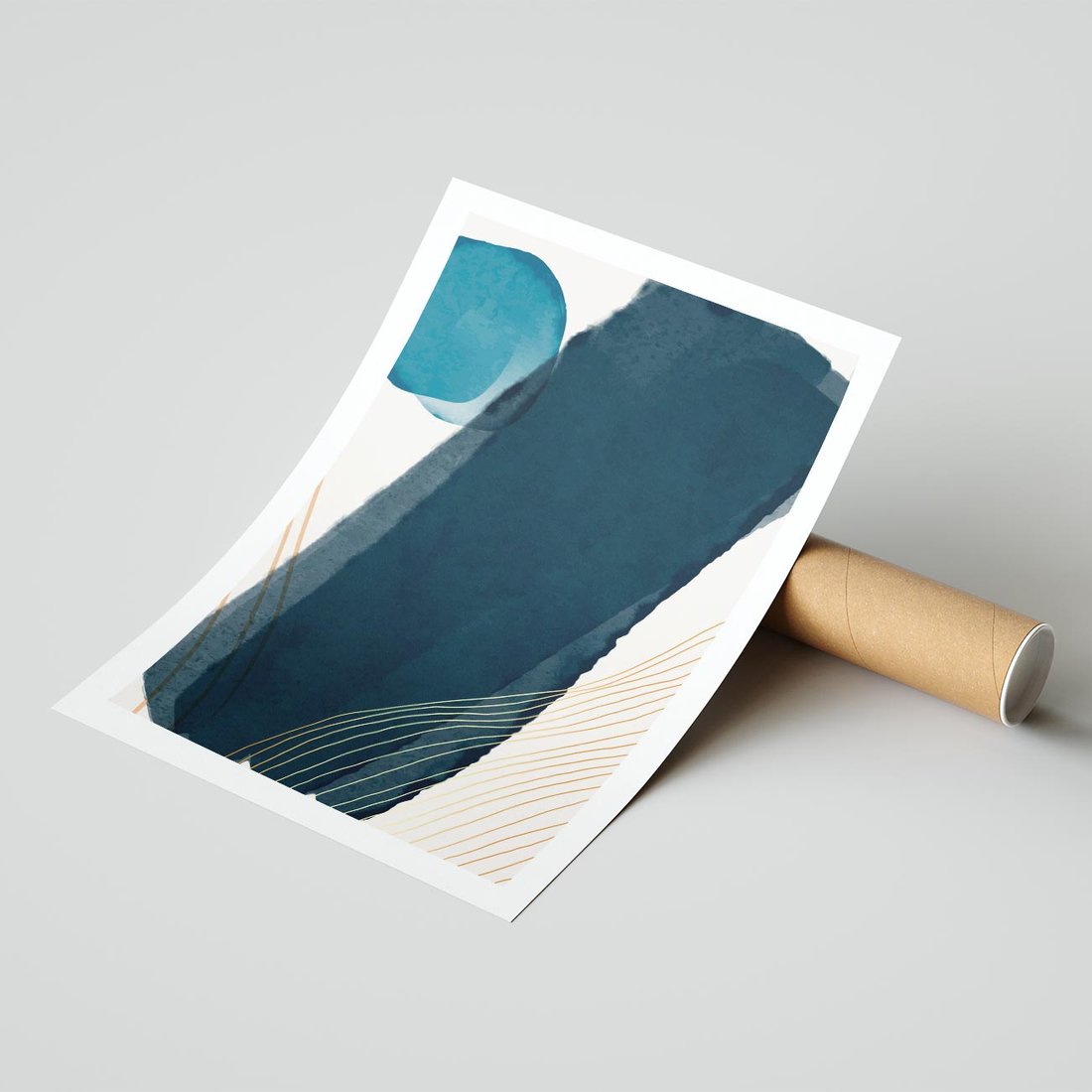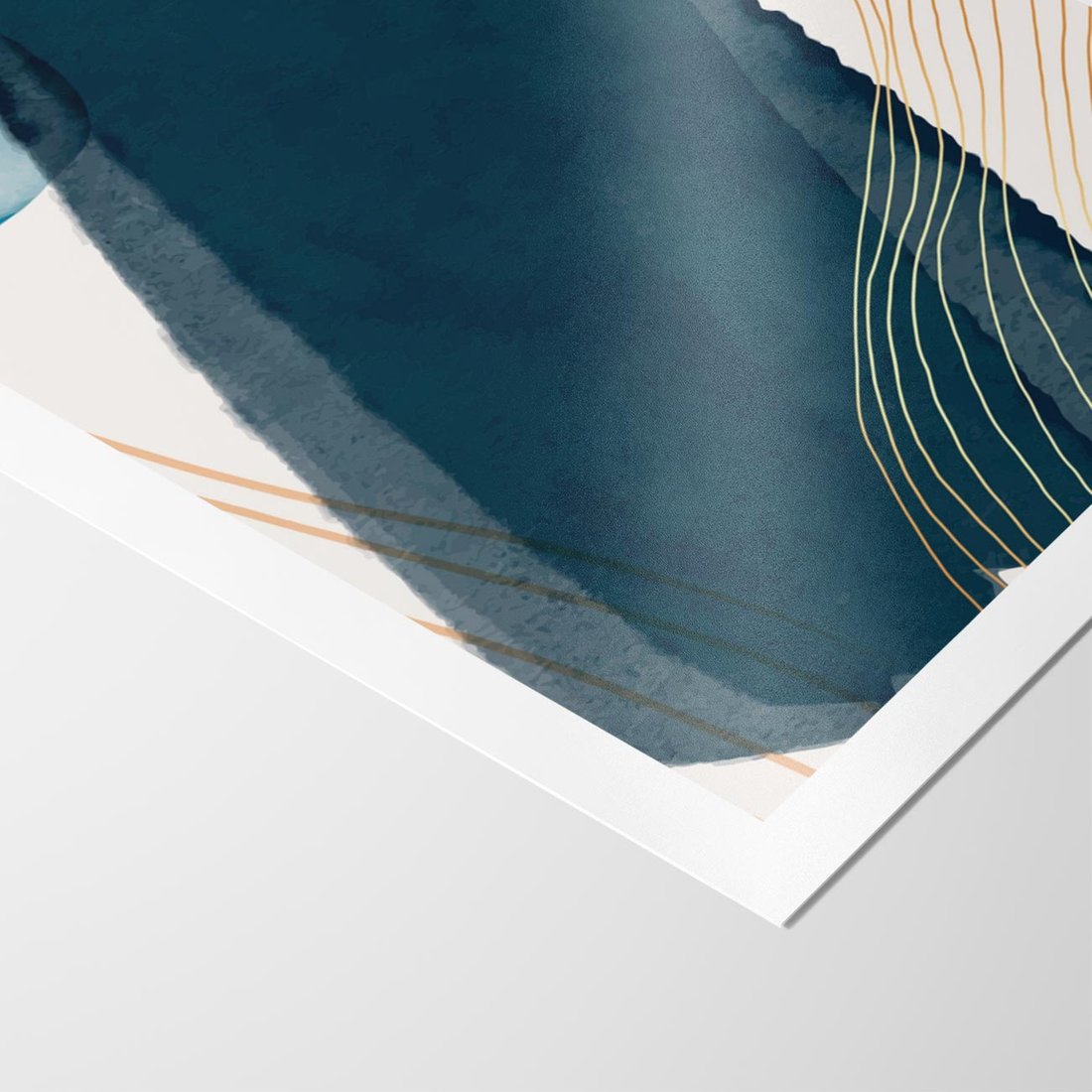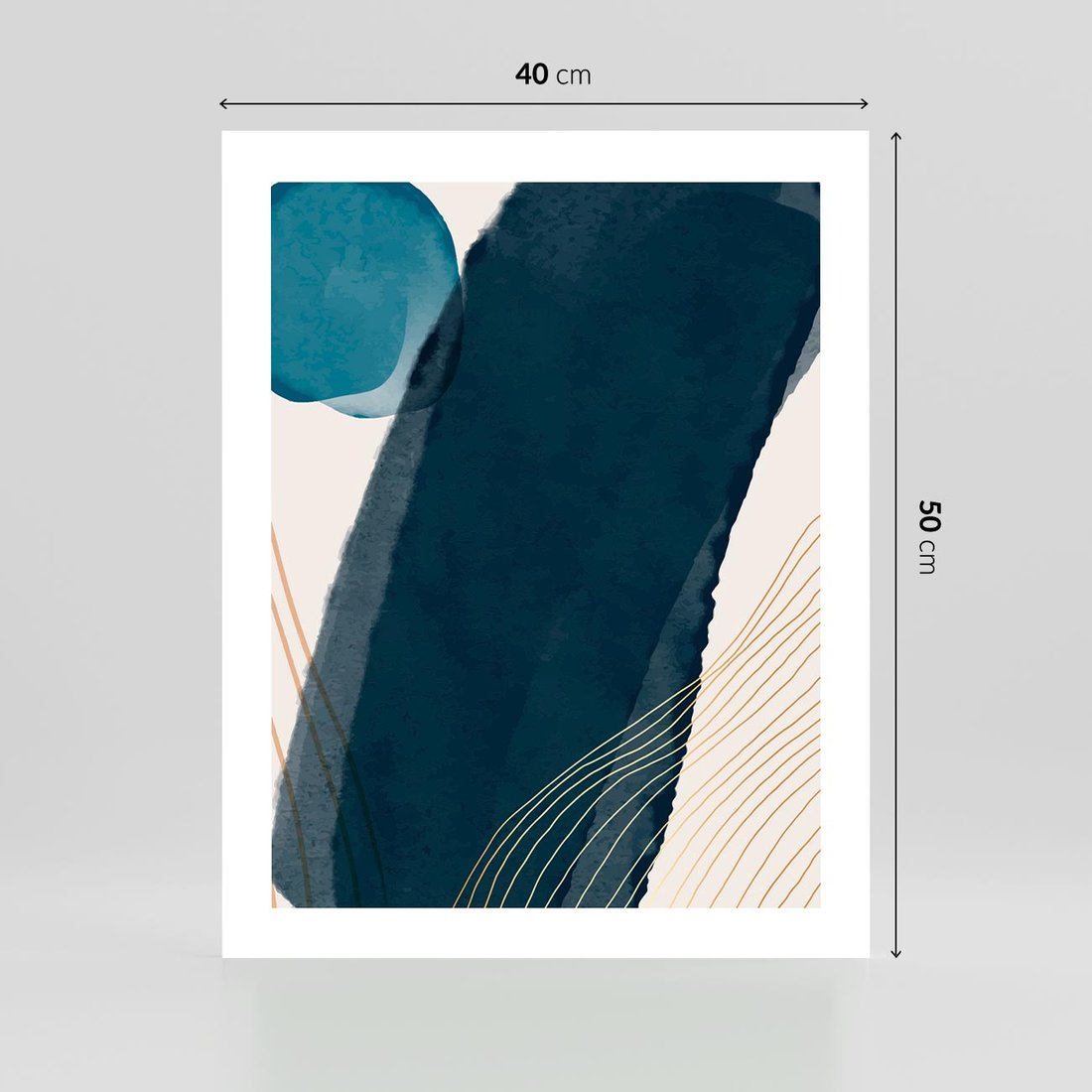 Nasz plakat to abstrakcyjna granatowa plama w technice akwareli, zdobiona złotymi elementami. To dzieło sztuki, które w dynamiczny sposób łączy głęboki kolor z subtelnym blaskiem złota, tworząc niezwykłą kompozycję o wyjątkowym wyrazie artystycznym.