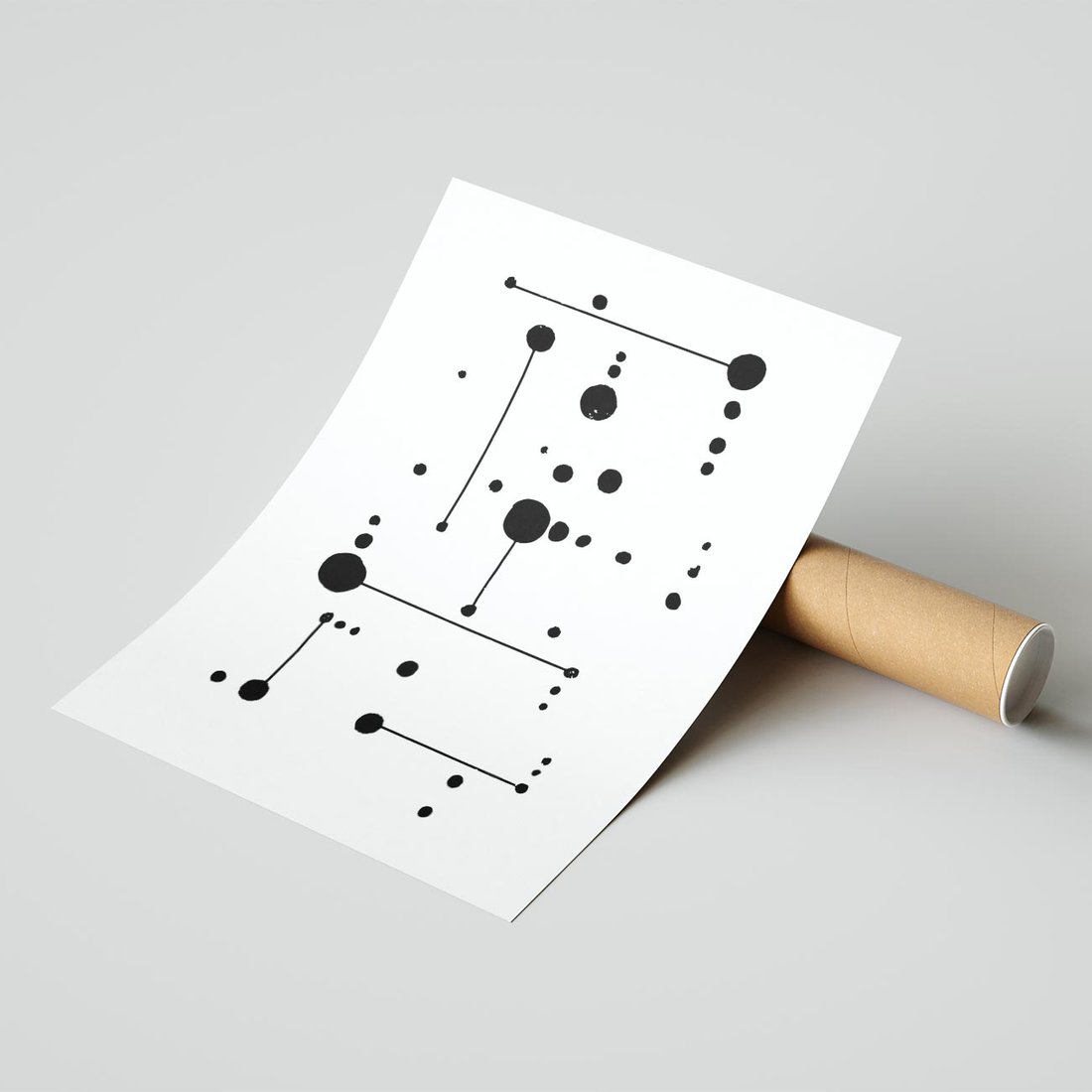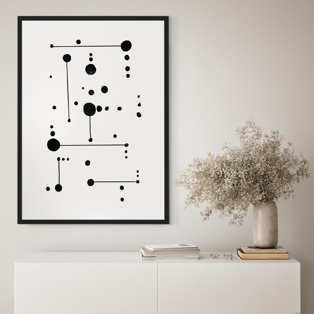 Nasz czarno-biały plakat to doskonałe połączenie abstrakcji i minimalizmu. Zastosowanie kropek i kresek tworzy fascynującą kompozycję, której wyrazistość wynika z kontrastu między czernią a bielą. Ten plakat jest hołdem dla prostoty i głębokich znaczeń, idealny dla miłośników artystycznej subtelności.