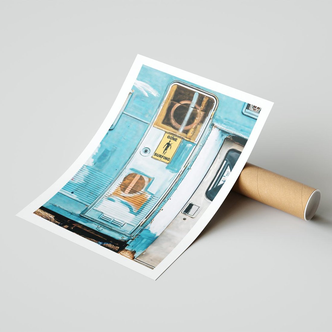 Plakat bez ramy 40x50 - Nostalgiczna Podróż - stara przyczepa kempingowa, niebieskie kolory