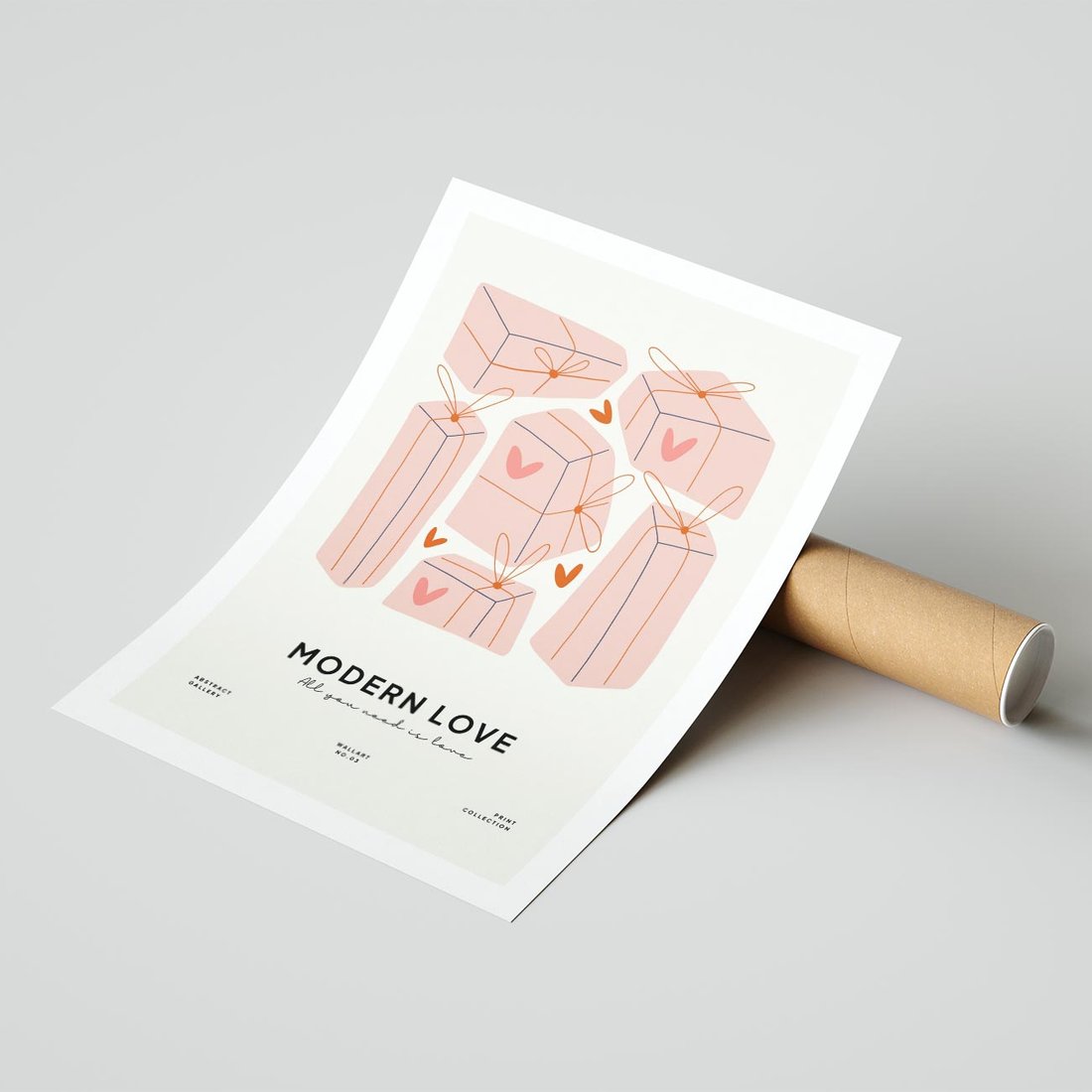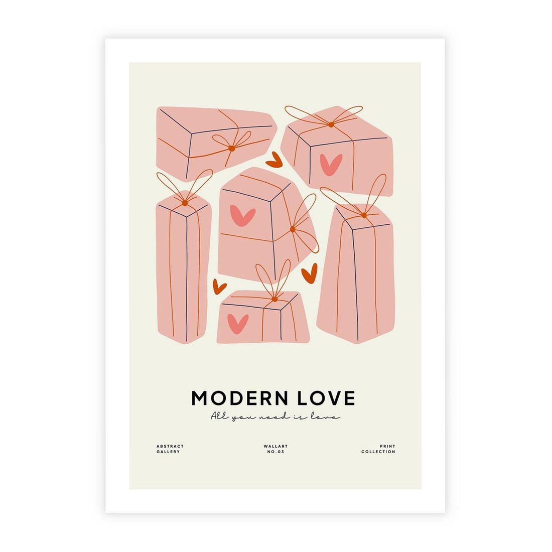 Ta nowoczesna grafika w pastelowych odcieniach ukazuje serduszka i prezenty, tworząc dynamiczną kompozycję. "Nowoczesna Miłość" to hołd dla uczucia w stylu współczesnym, z subtelną typografią "Modern Love". Obraz ten wniesie do wnętrza dawkę radości i romantyzmu, jednocześnie podkreślając nowoczesny charakter miłości.