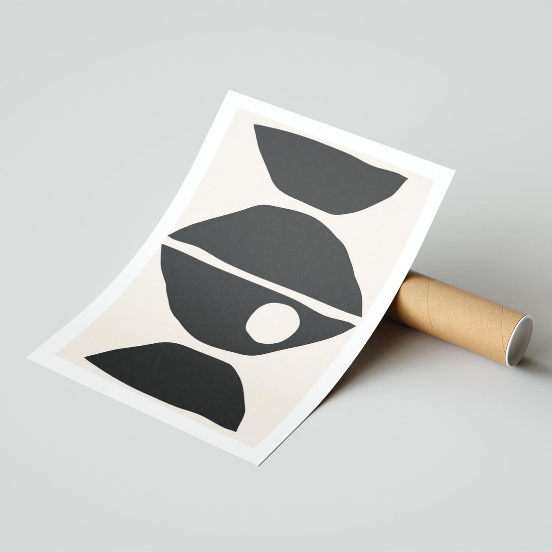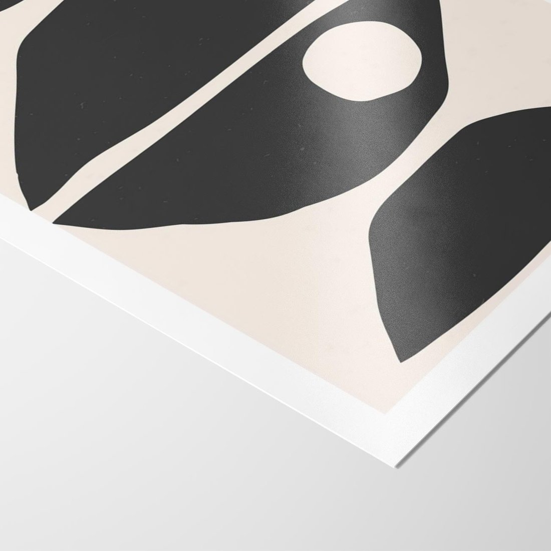 To abstrakcyjne dzieło sztuki, w którym dominują czarne kształty na delikatnym beżowym tle. Obraz przyciąga uwagę swoją nowoczesną estetyką i abstrakcyjnym wyrazem.