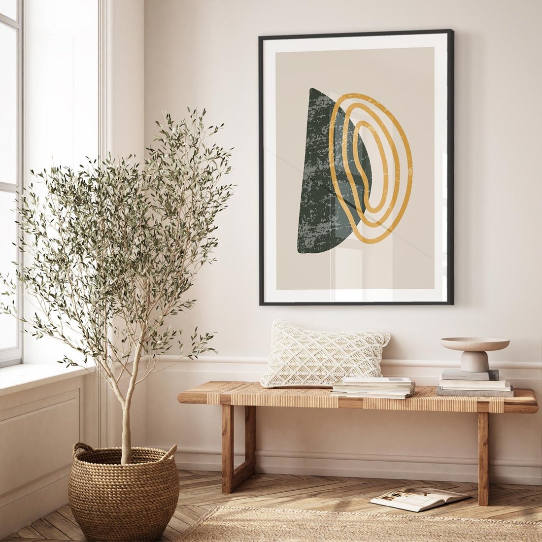 Nasz nowoczesny plakat to abstrakcyjne kształty w stonowanych brązowych odcieniach. To połączenie minimalizmu i nowoczesnej sztuki tworzy spokojną, lecz wyrazistą kompozycję, idealną do wnętrz poszukujących harmonii i subtelnego wyrażenia artystycznego.