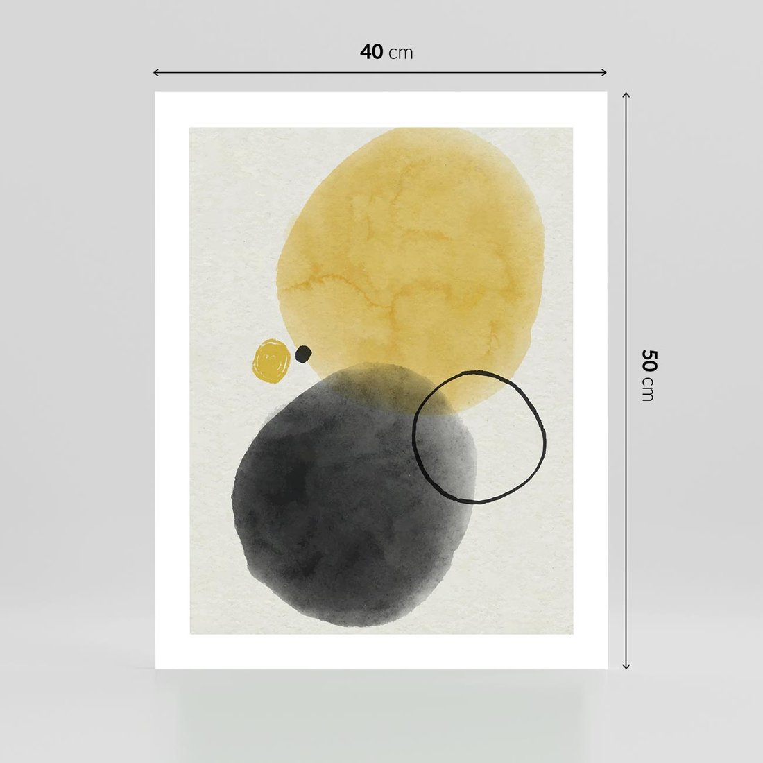 Nasza abstrakcja to zmysłowa kombinacja akwarelowych plam w kontrastujących odcieniach czerni i żółtego. To artystyczne połączenie tworzy fascynujący dialog między kolorami, dodając dynamiczności i głębi do przestrzeni.