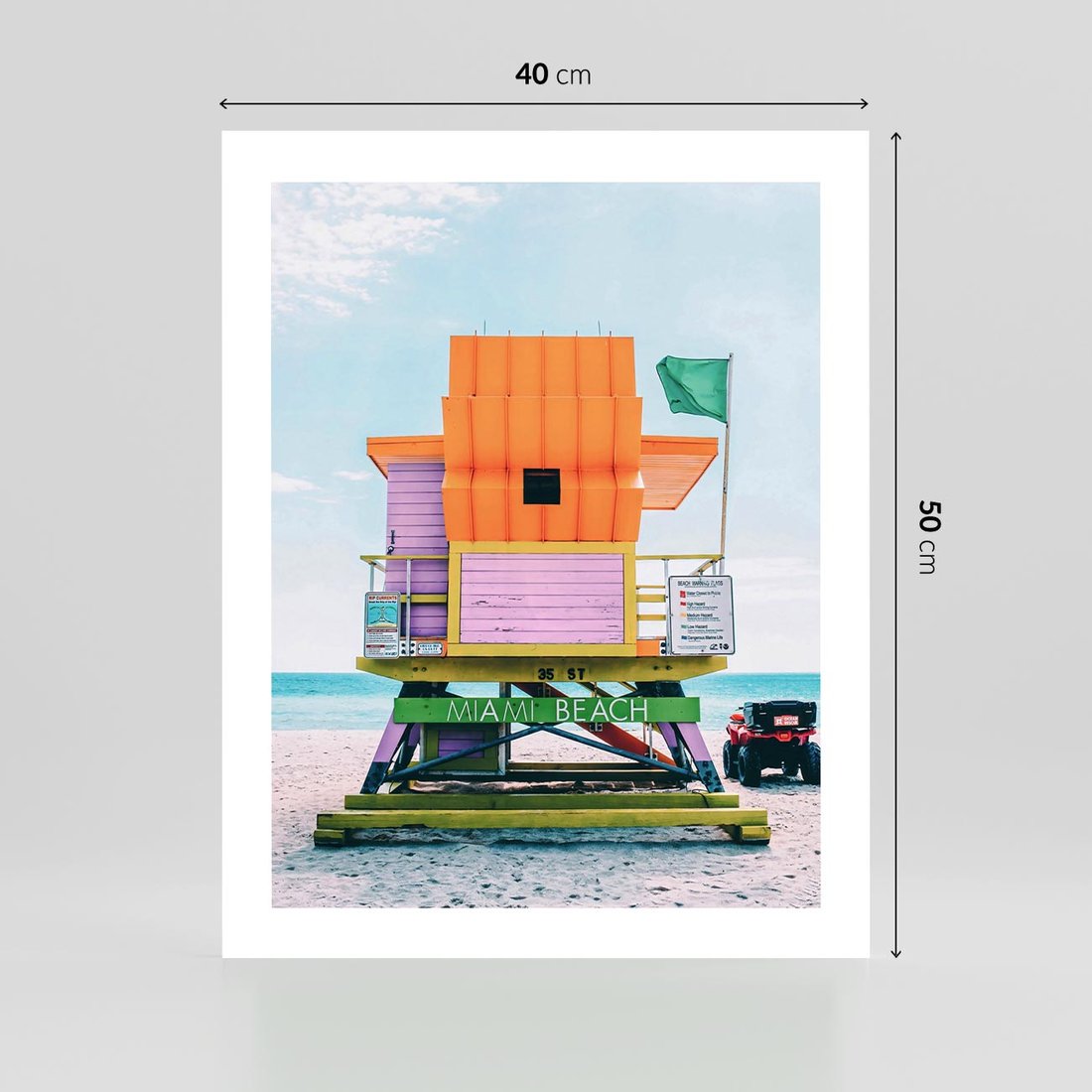 Plakat bez ramy 40x50 - Plaża Miami w Słoneczny Dzień - domek ratownika, kolorowy