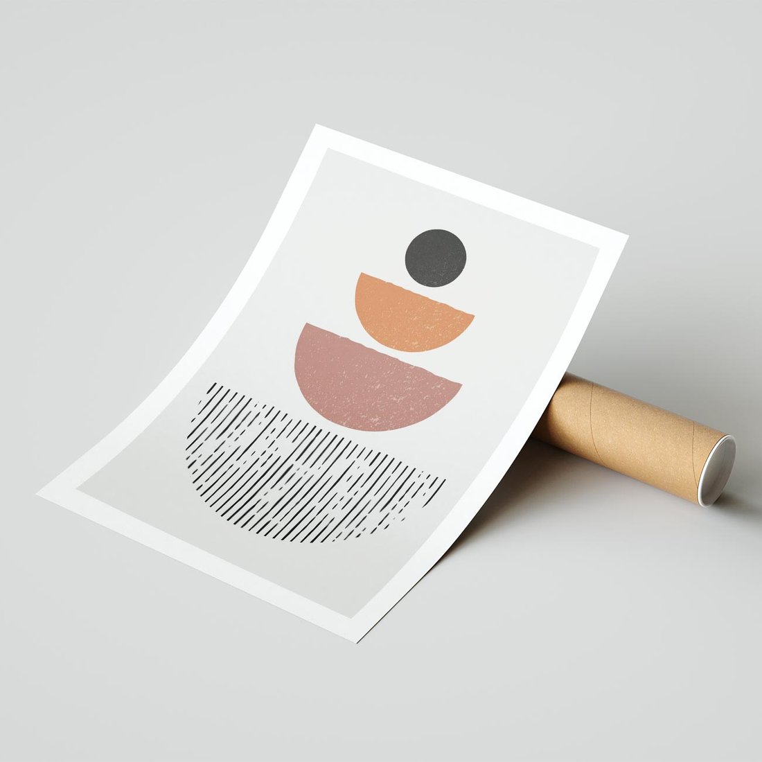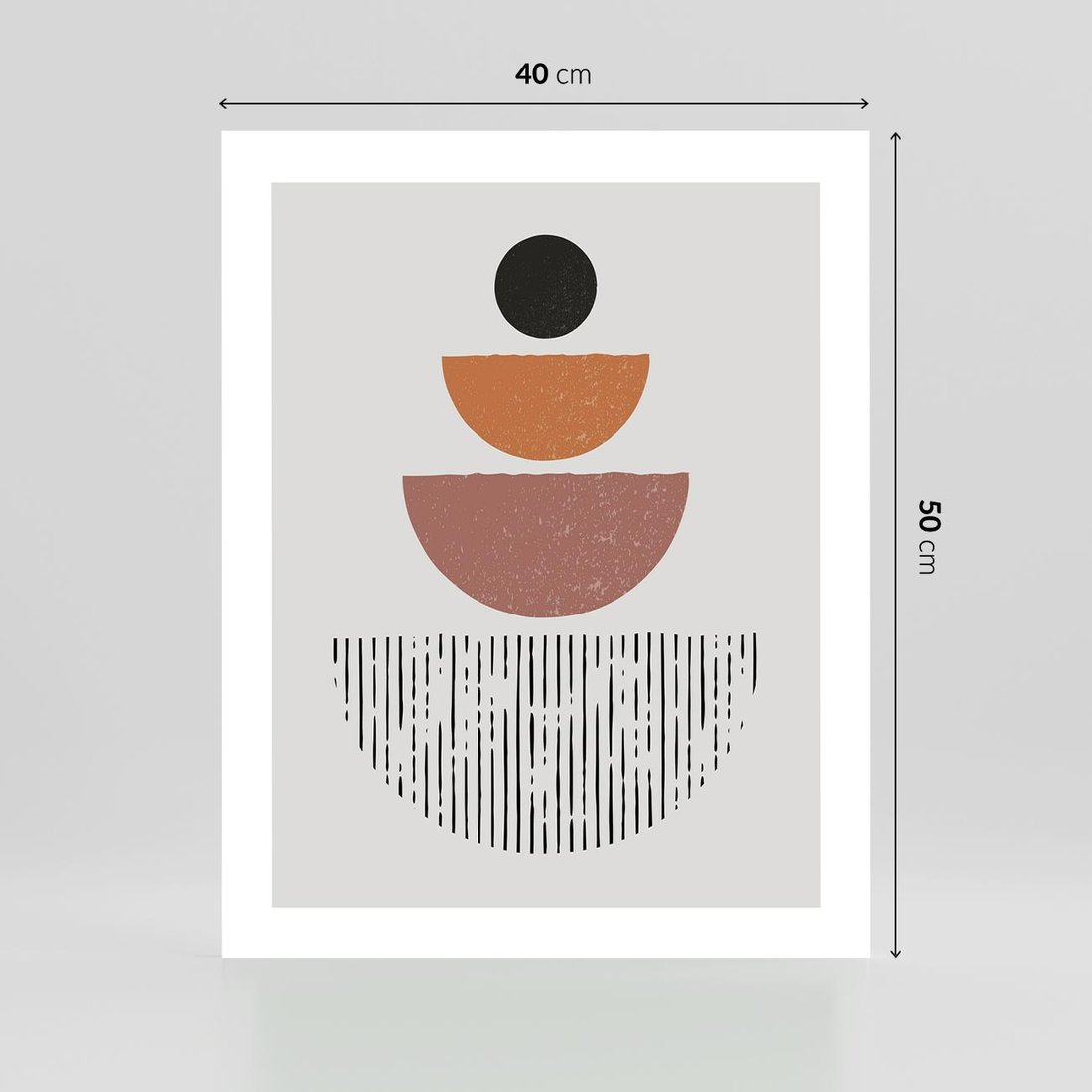 Obraz przedstawia geometryczną kompozycję półkół w stylu midcentury, który dodaje nutkę boho stylu. Ta kompozycja jest pełna wyrazu i elegancji.
