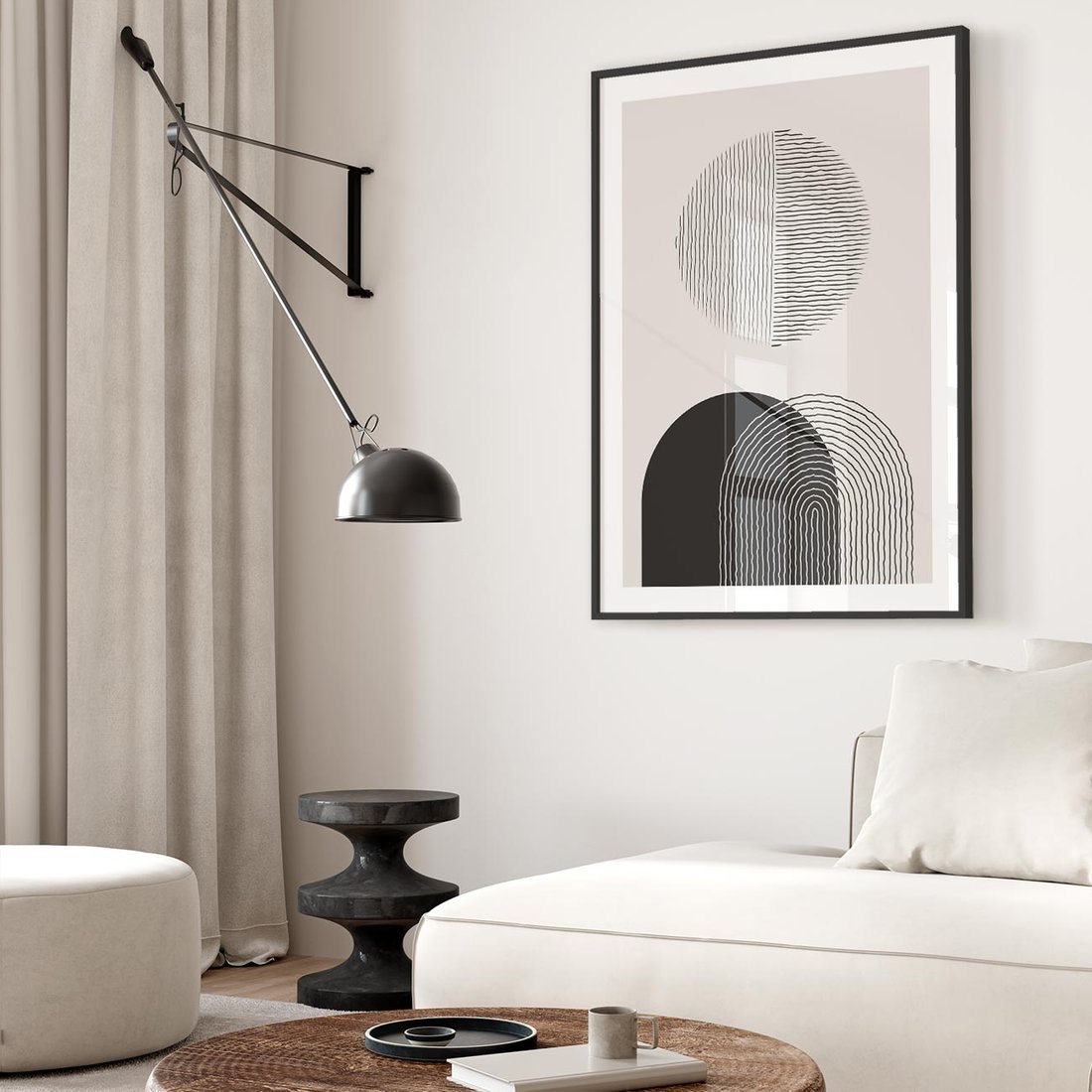 To unikalne dzieło sztuki ukazuje abstrakcyjną kompozycję, w której dominują okręgi i półokręgi. W stonowanych odcieniach czerni i beżu, tworzy minimalistyczną i spokojną atmosferę. Formy te są ze sobą delikatnie splecione, tworząc dynamiczny ruch i równowagę jednocześnie. Kompozycja zachęca widza do refleksji i interpretacji, emanując jednocześnie prostotą i elegancją charakterystyczną dla minimalistycznego stylu.