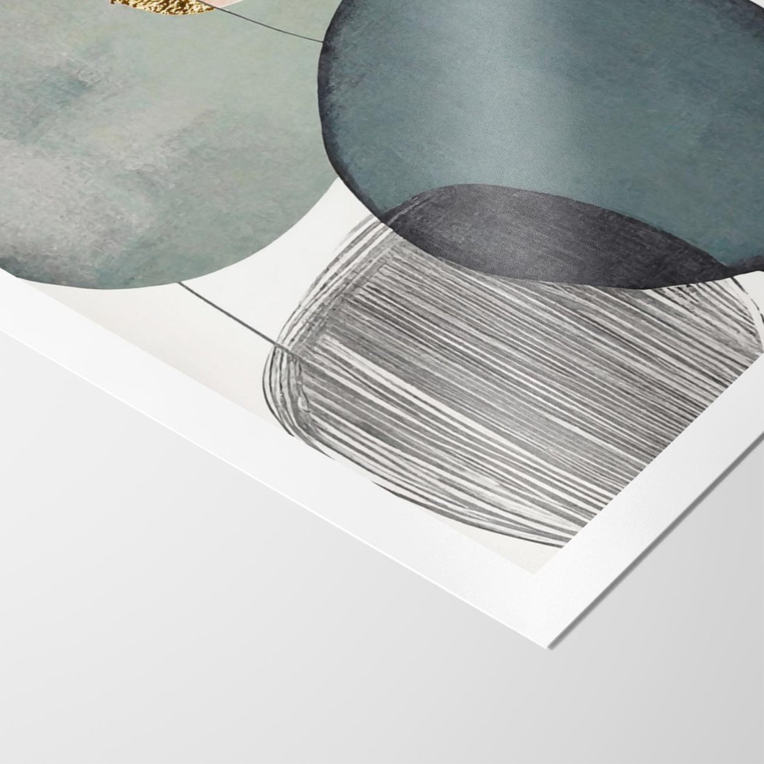 Ten abstrakcyjny obraz to połączenie geometrycznych, obłych form w stonowanych odcieniach szarości i czerni. W minimalistycznym stylu, kompozycja ta emanuje spokojem i nowoczesnością, doskonale wpisując się w różnorodne wnętrza.