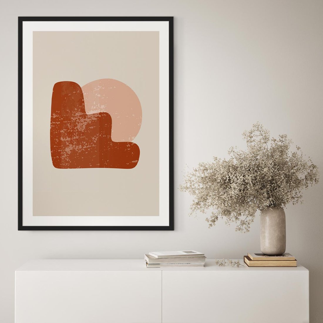 Nasz nowoczesny plakat to zbiór abstrakcyjnych kształtów w stonowanych brązowych odcieniach. To minimalistyczne dzieło sztuki wprowadza elegancję i wyrafinowanie do Twojej przestrzeni, tworząc jednocześnie ciekawą kompozycję z nowoczesnym akcentem.