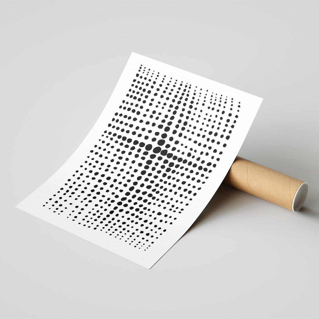 Nasz minimalistyczny plakat prezentuje abstrakcyjną kompozycję z czarnych kropek, tworząc efektowną grafikę w czarno-białym stylu. To dzieło sztuki wprowadzi do Twojej przestrzeni prostotę i wyrazistość, stanowiąc doskonały akcent dla miłośników minimalizmu.