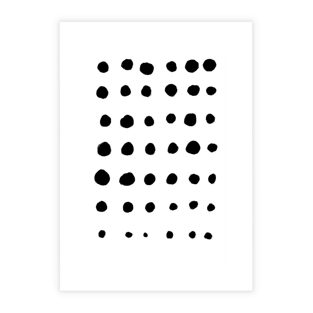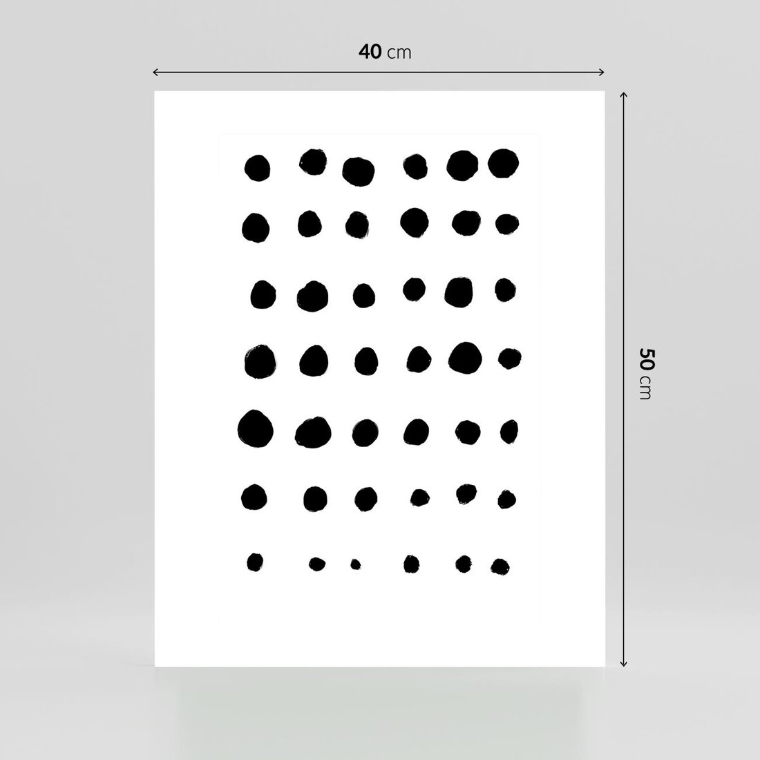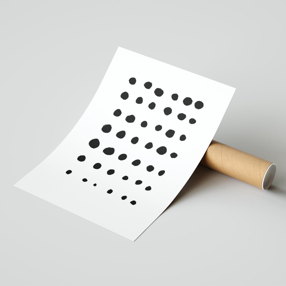 Ten monochromatyczny plakat przedstawia minimalistyczną kompozycję czarnych kropek na białym tle. Prosta, ale wyrazista forma doskonale oddaje estetykę minimalistycznego designu, sprawiając, że plakat będzie eleganckim dodatkiem do różnych przestrzeni.