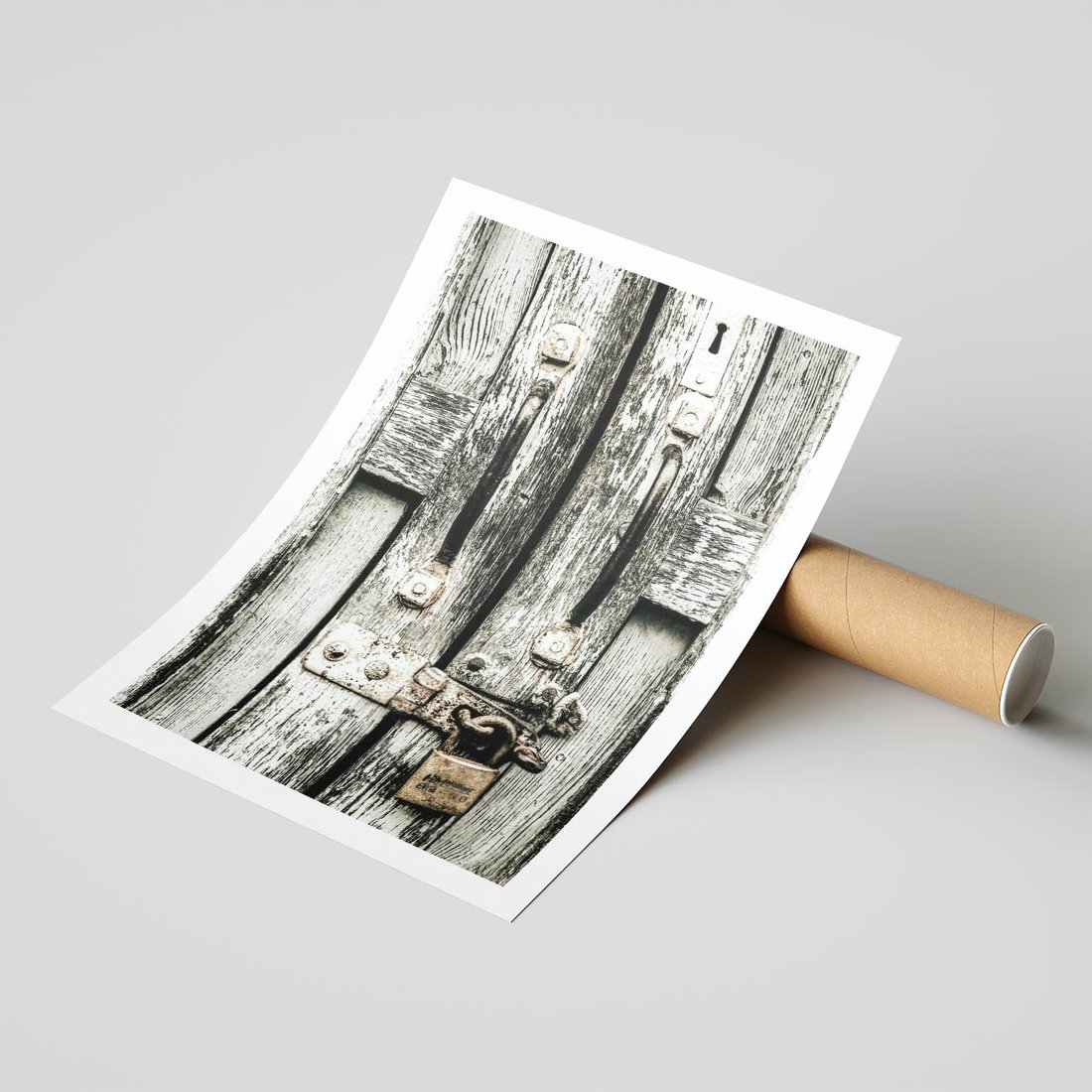 Plakat bez ramy 40x50 - Retro Drzwi: Zamknięta Tajemnica - stare drzwi, kłódka
