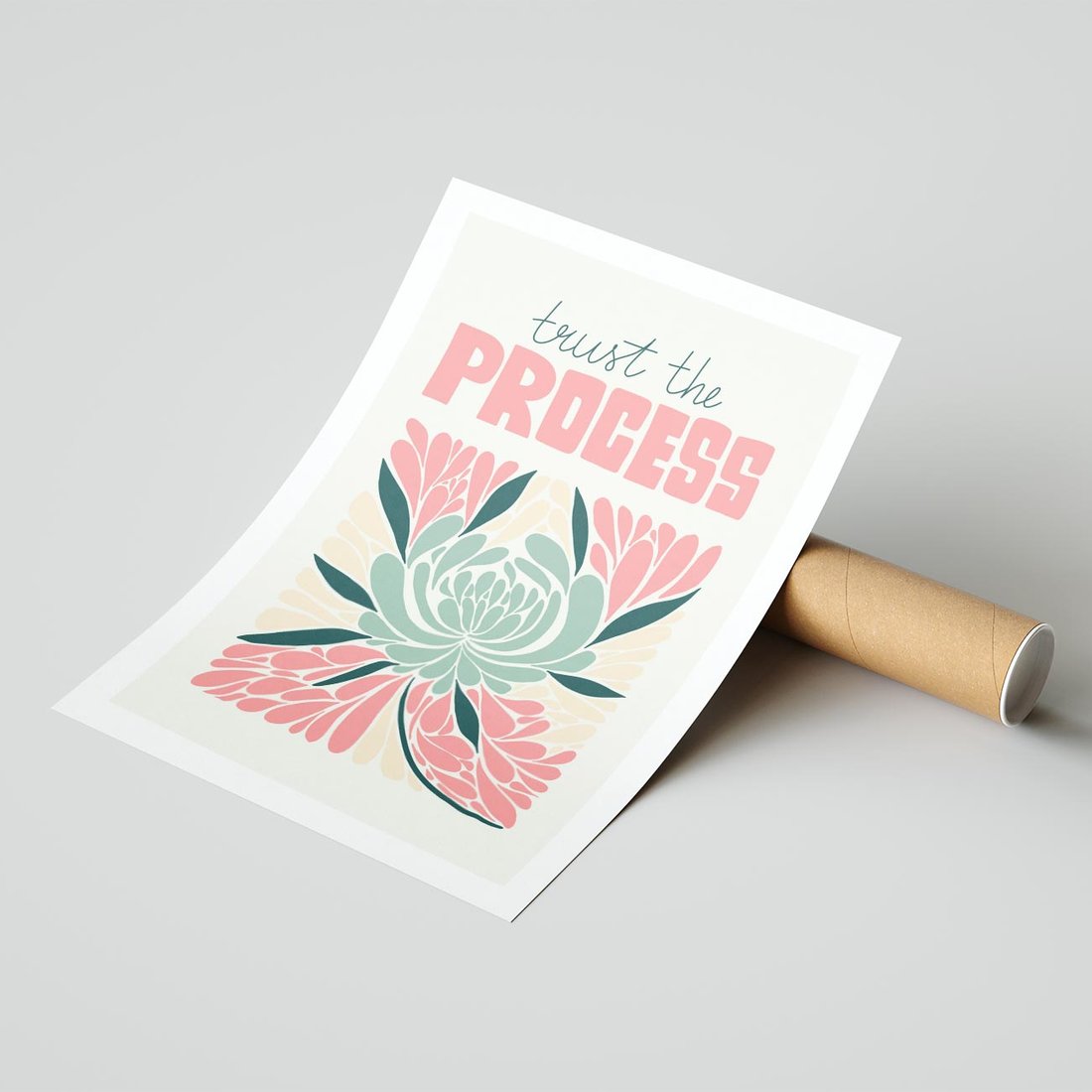 Ta nowoczesna sztuka łączy abstrakcyjny pastelowy kwiat z wyrazistą typografią, tworząc harmonijną kompozycję. Sztuka ta przenosi nas w delikatny świat estetyki, inspirując do refleksji i postrzegania piękna w subtelności.