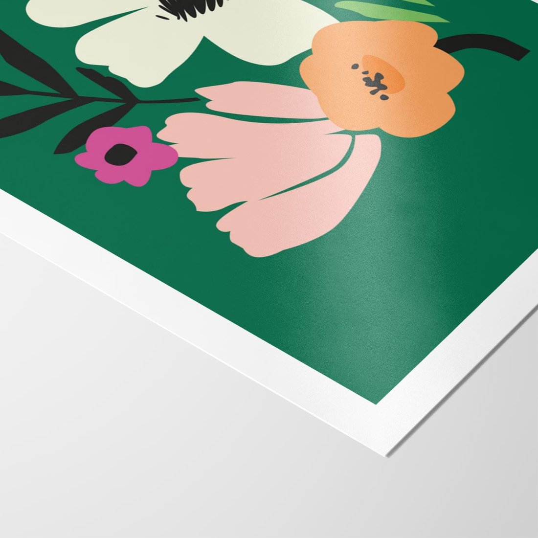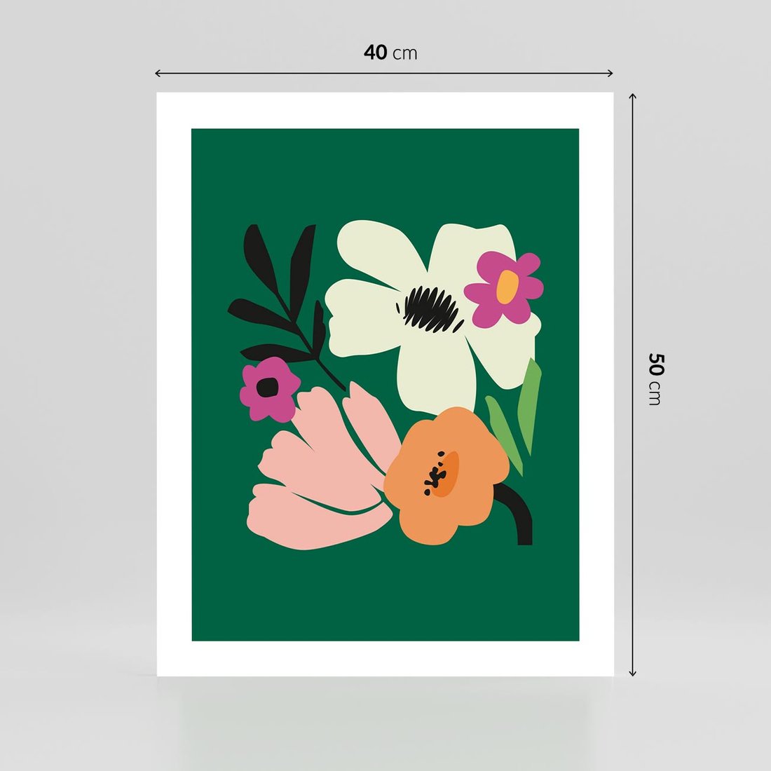 Ten nowoczesny plakat przedstawia abstrakcyjne kwiaty na spokojnym, zielonym tle. Kompozycja ta przynosi do przestrzeni oddech natury w nowatorski i artystyczny sposób, tworząc unikalny punkt centralny w Twoim wnętrzu.
