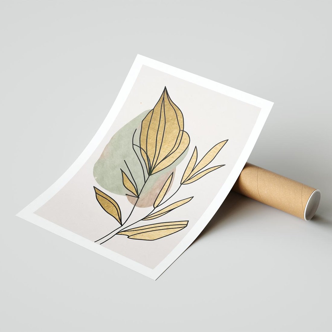 Ten abstrakcyjny obraz w stylu boho jest prawdziwym dziełem sztuki, gdzie liście łączą się z delikatnymi złotymi elementami, tworząc piękny kontrast i harmonię. Złote liście dodają elegancji i blasku, podkreślając naturalne piękno roślin. Kompozycja emanuje subtelnym urokiem i przytulnością, idealnie pasując do różnych wnętrz i dodając im wyjątkowego charakteru.