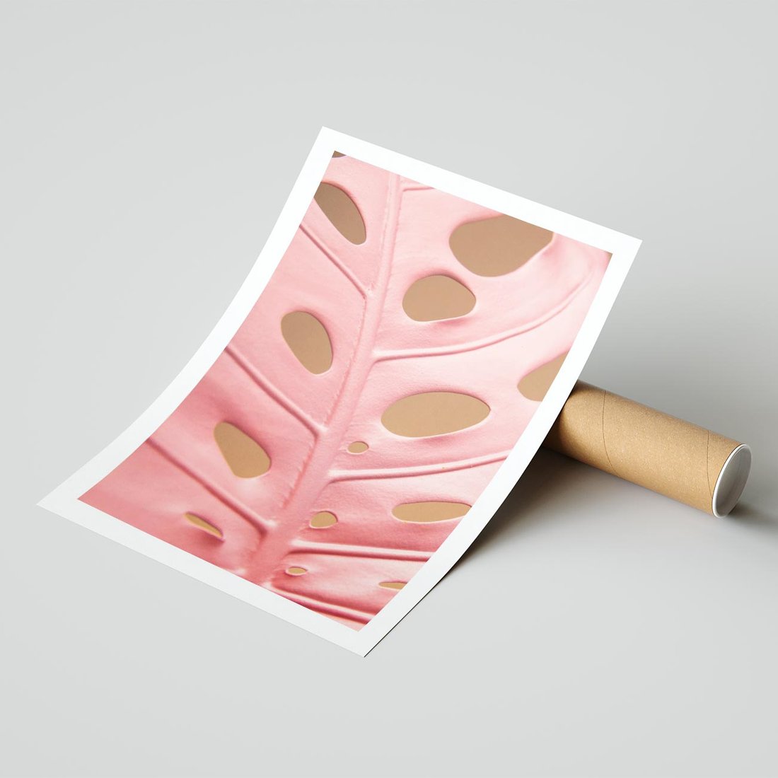 Obraz przedstawia nowoczesną fotografię różowego liścia monstery, podkreślając jego wyjątkowe piękno.