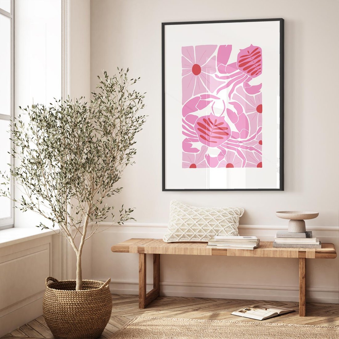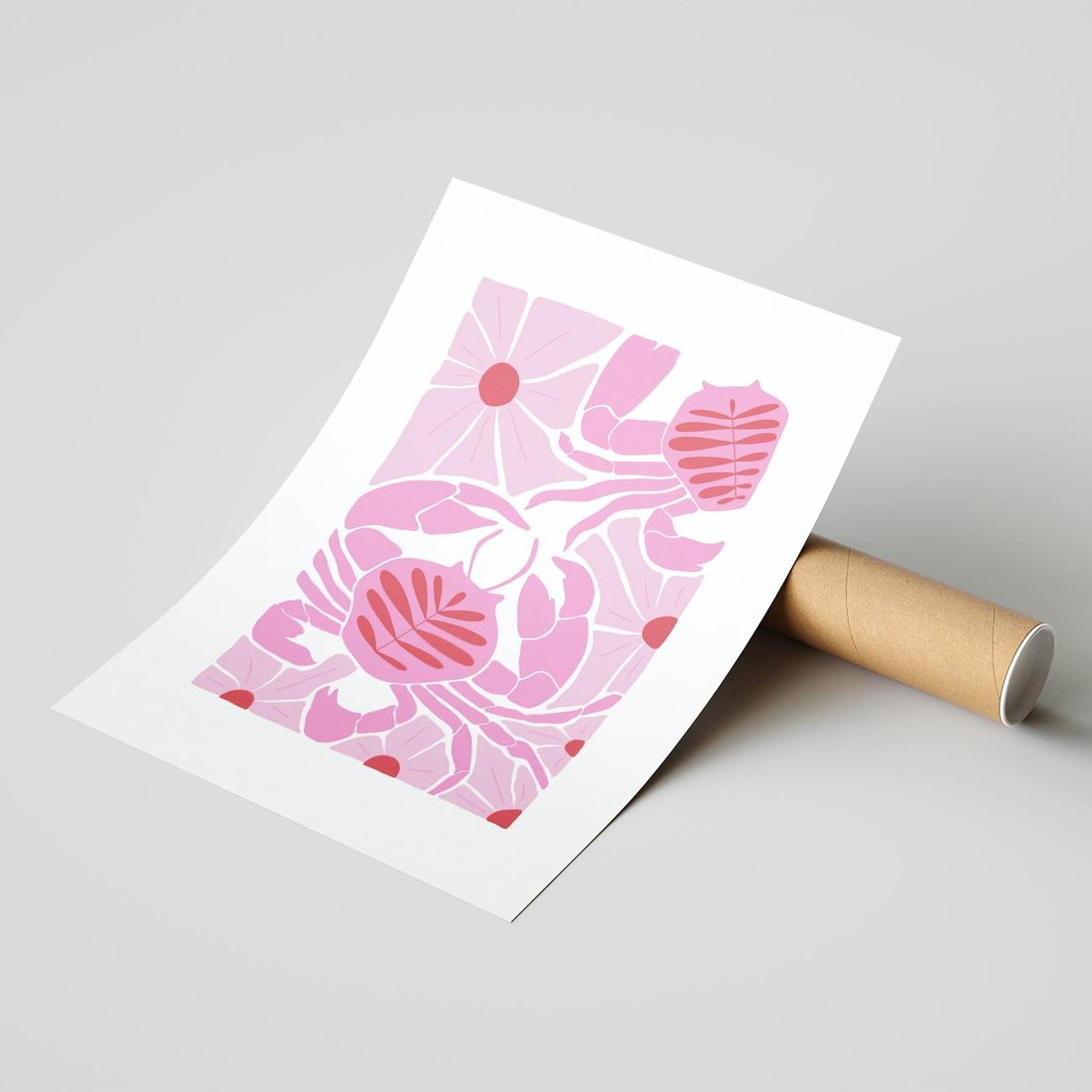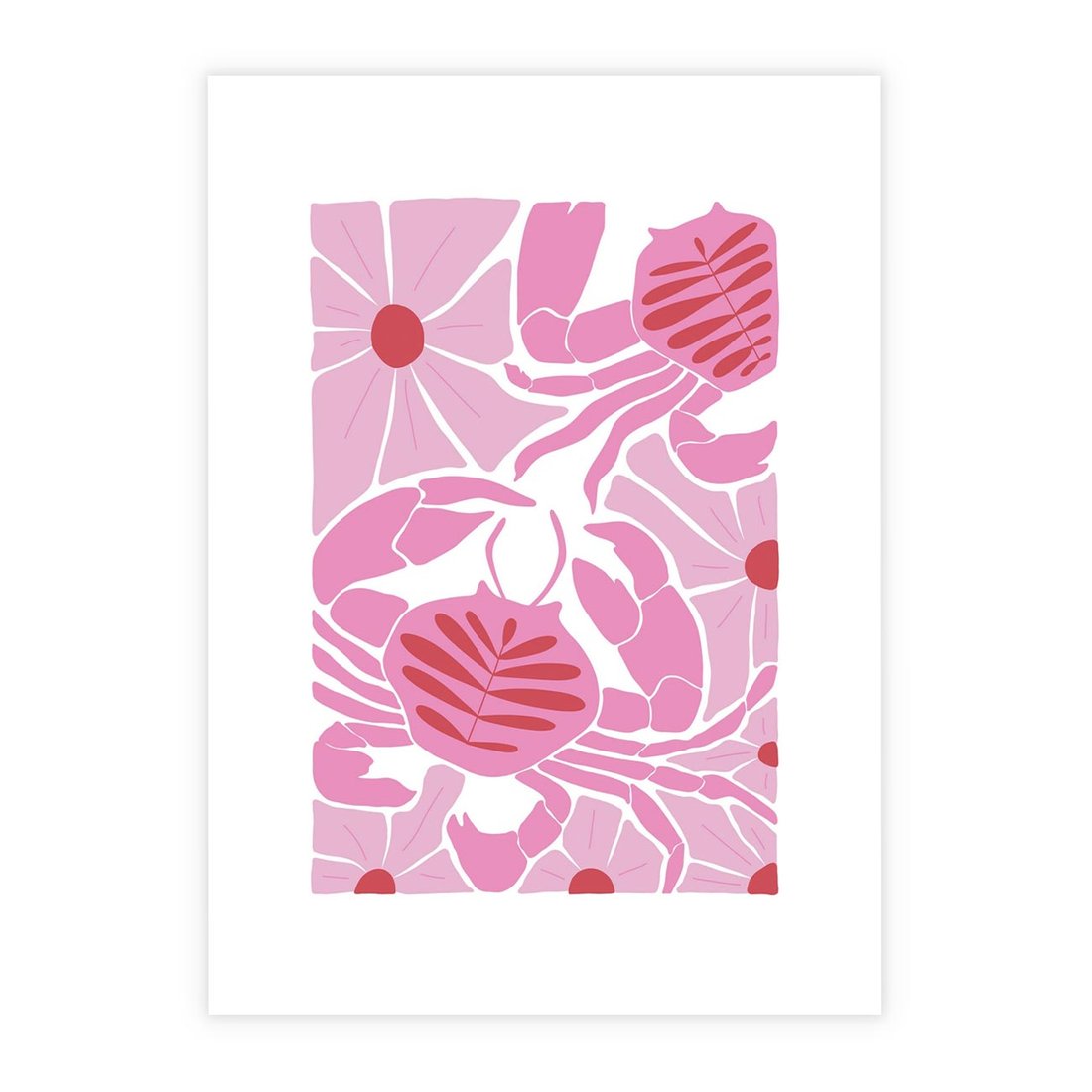 Plakat bez ramy 40x50 - Roztańczone Kraby - różowe kwiaty i kraby, abstrakcyjna kompozycja