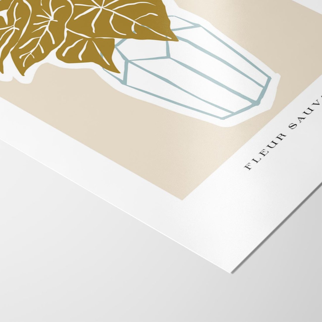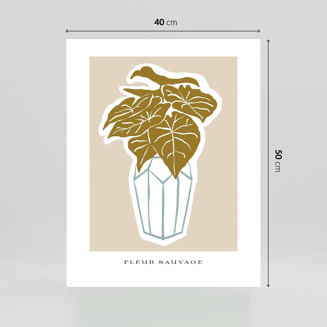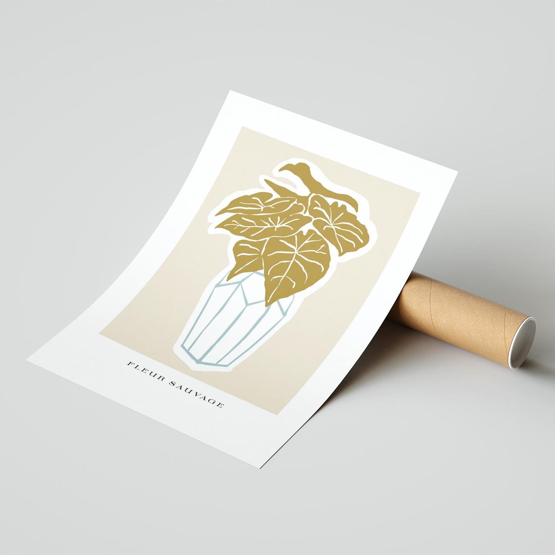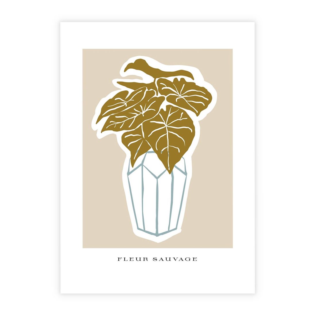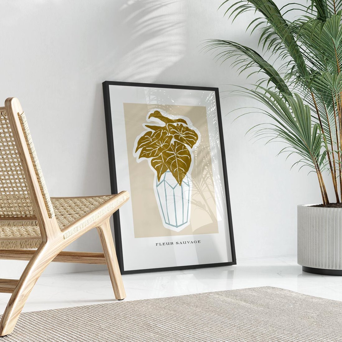 Ten plakat prezentuje abstrakcyjne, tropikalne liście w minimalistycznym wazonie, uzupełnione delikatną typografią. Sztuka ta eksploruje formy liści w sposób abstrakcyjny, tworząc spokojną i równocześnie ekspresyjną kompozycję. Poprzez wykorzystanie minimalizmu, plakat staje się unikalnym elementem dekoracyjnym, który wprowadza do Twojej przestrzeni zarówno naturalny urok, jak i artystyczną atmosferę.
