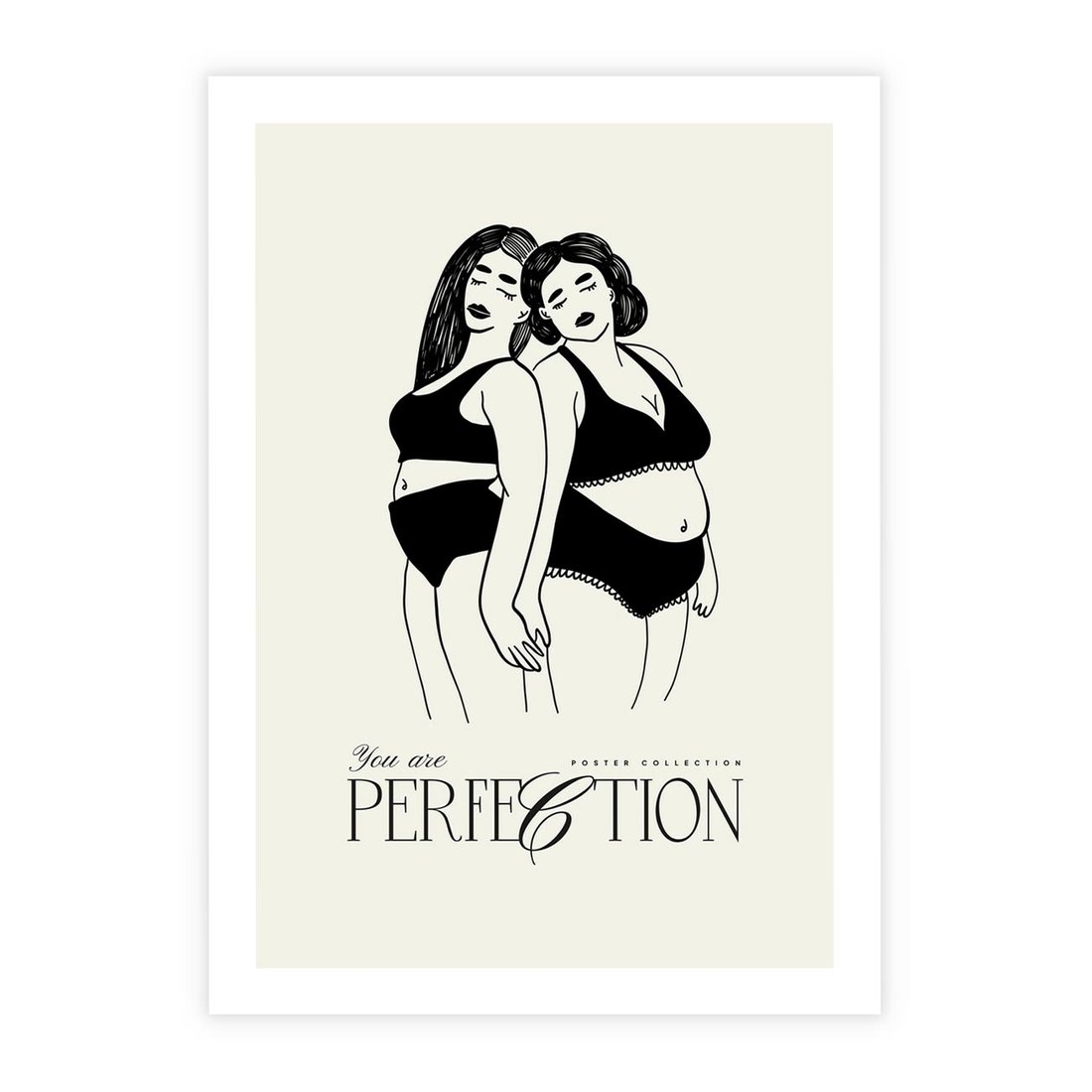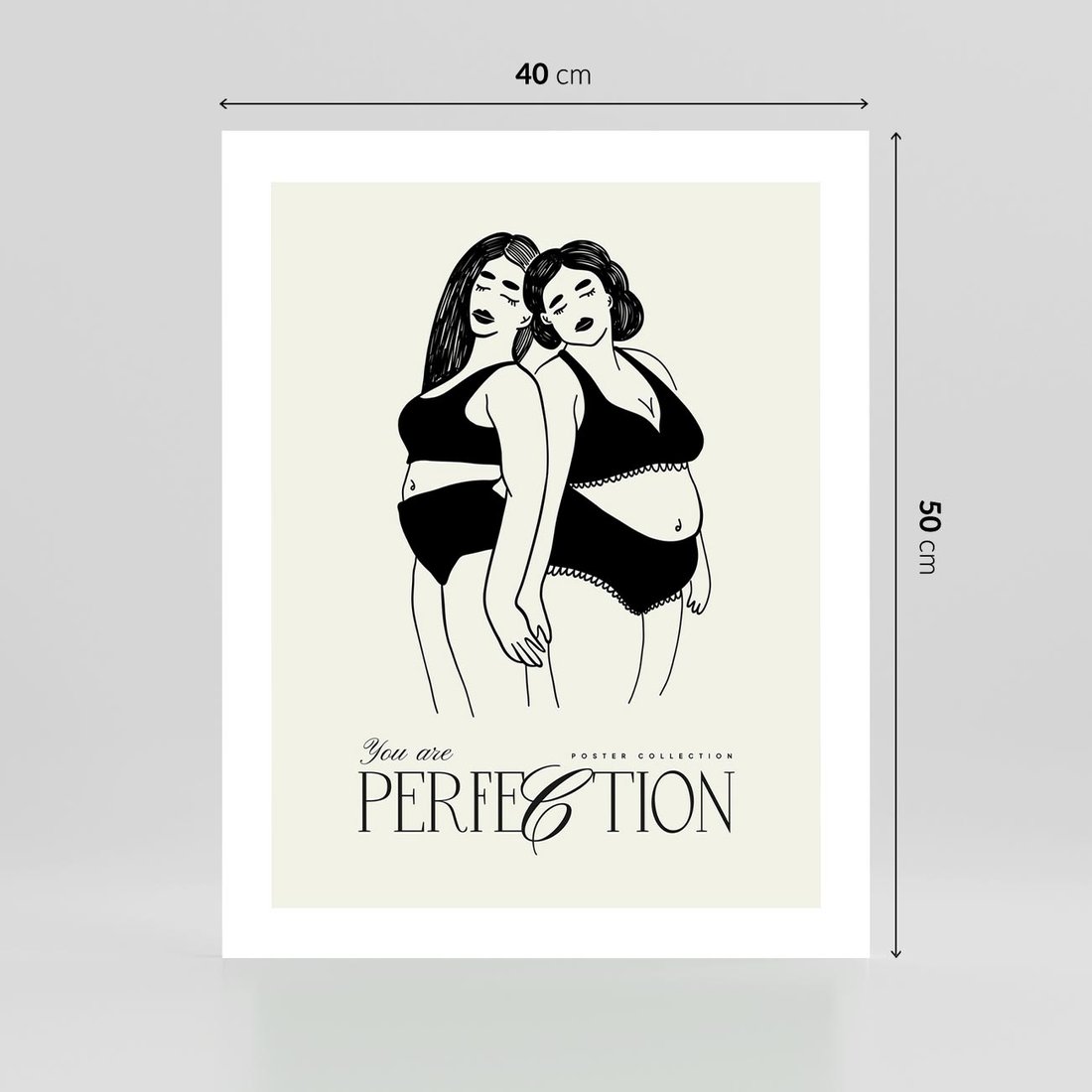 Ten nowoczesny plakat przedstawia dwie kobiety w bieliźnie, promując wartość samoakceptacji. Ich połączenie symbolizuje wspólnotę i siłę kobiecej natury, podkreślanej inspirującą typografią.