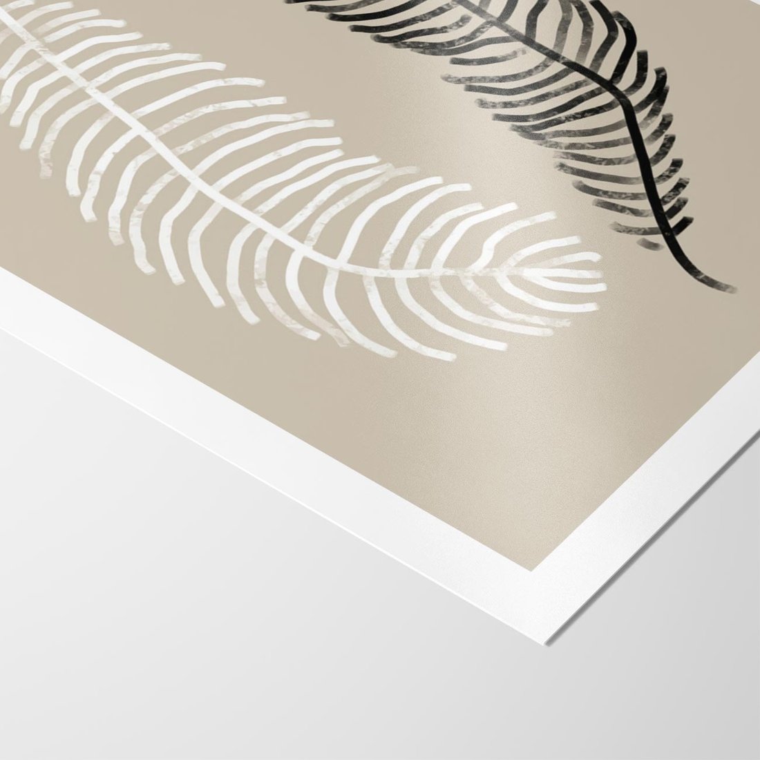 Nasza nowoczesna sztuka to minimalistyczna kompozycja białego i czarnego pióra na spokojnym beżowym tle. To dzieło wydobywa piękno prostoty, gdzie subtelne kontrasty i delikatne linie tworzą wrażenie równowagi i elegancji. Ten obraz przyniesie do Twojej przestrzeni spokój i harmonię, oddając hołd estetyce, która podkreśla moc piękna w prostych detalach.
