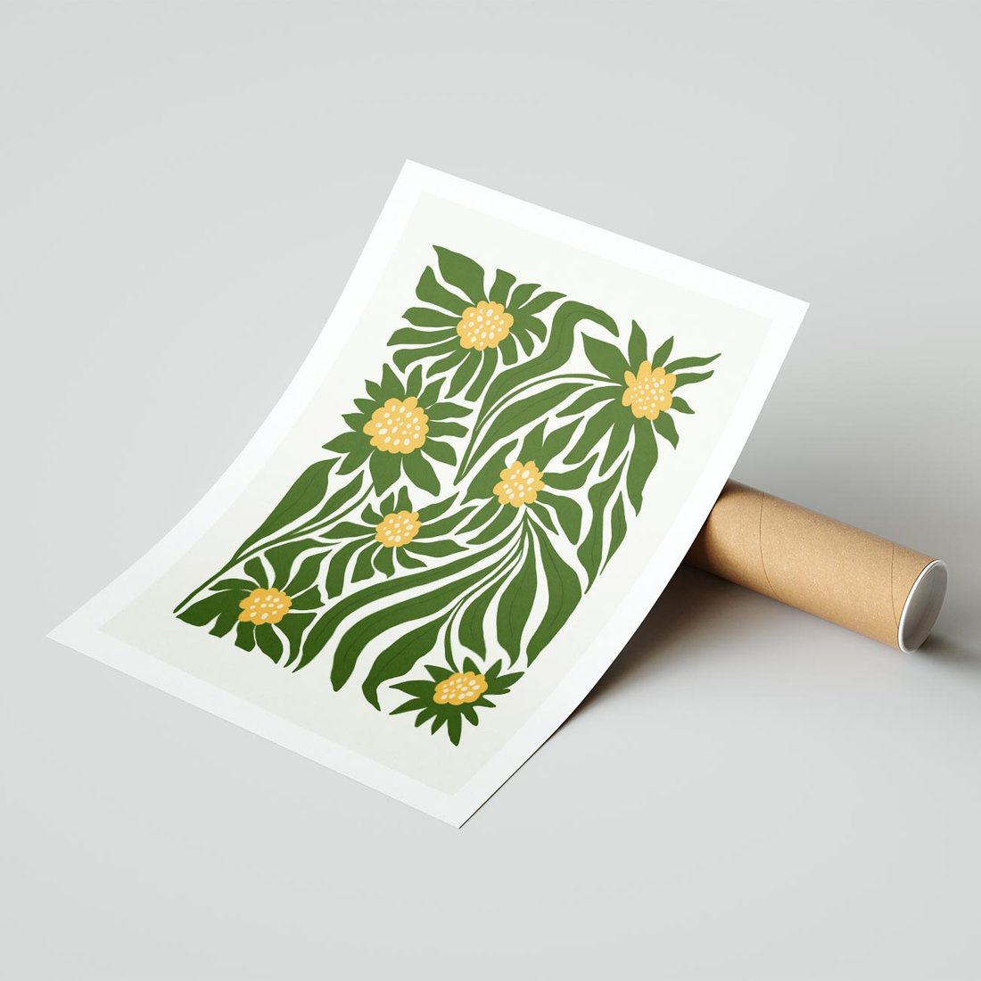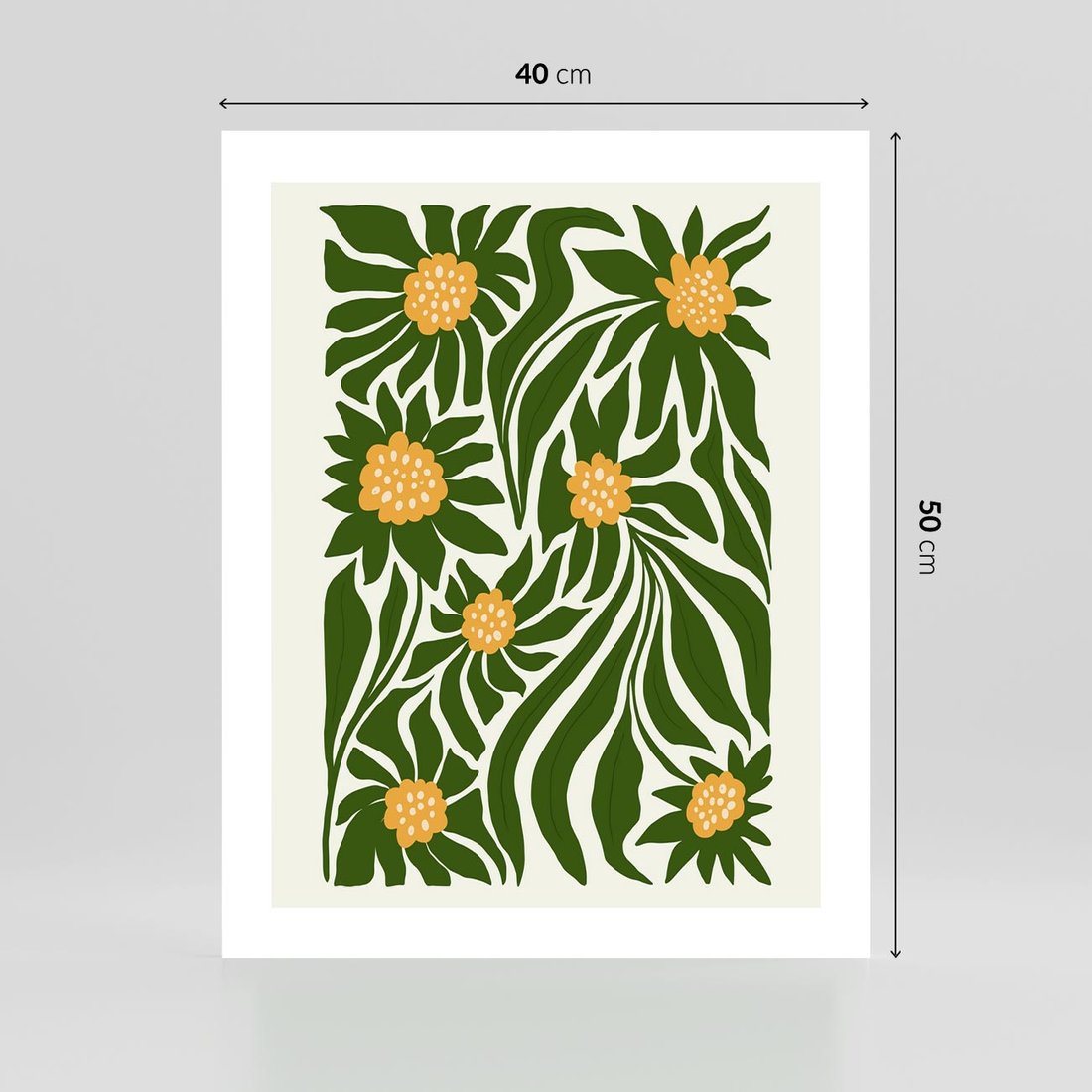 Ta abstrakcyjna kompozycja ukazuje kwiaty w wyjątkowo niekonwencjonalny sposób. Zieleń i żółć splatają się w harmonijną całość, tworząc abstrakcyjne pejzaże natury. Bez tytułu obraz zachęca do indywidualnych interpretacji, pozostawiając przestrzeń dla wyobraźni i refleksji.