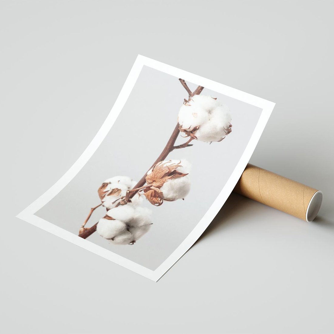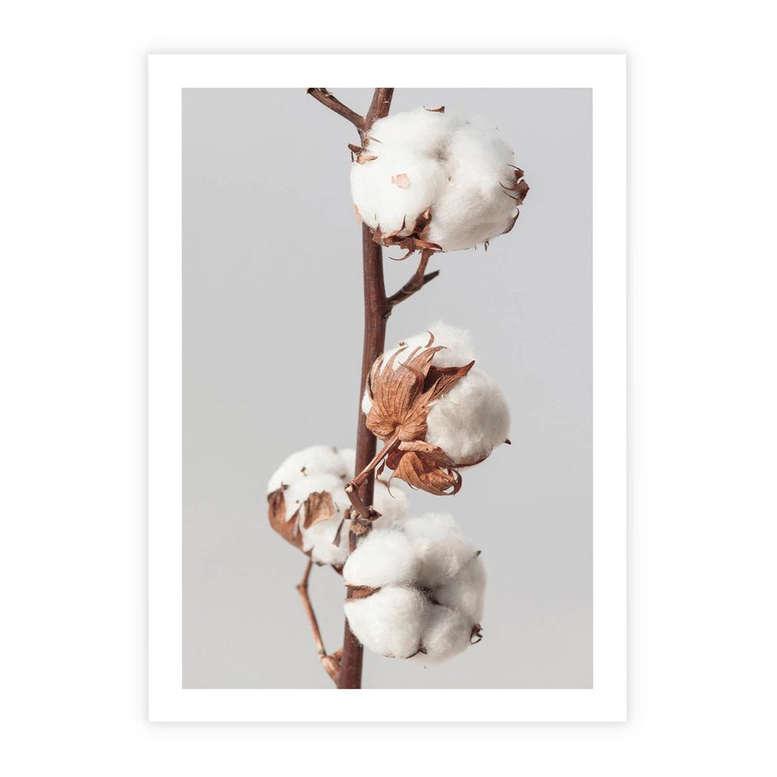 Obraz przedstawia prostą, spokojną fotografię gałązki bawełny. Ta minimalistyczna kompozycja doskonale wpasowuje się w wnętrza o nowoczesnym lub skandynawskim charakterze, nadając im delikatnej elegancji.