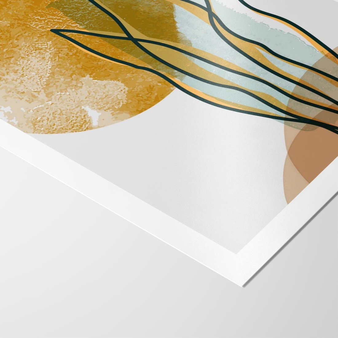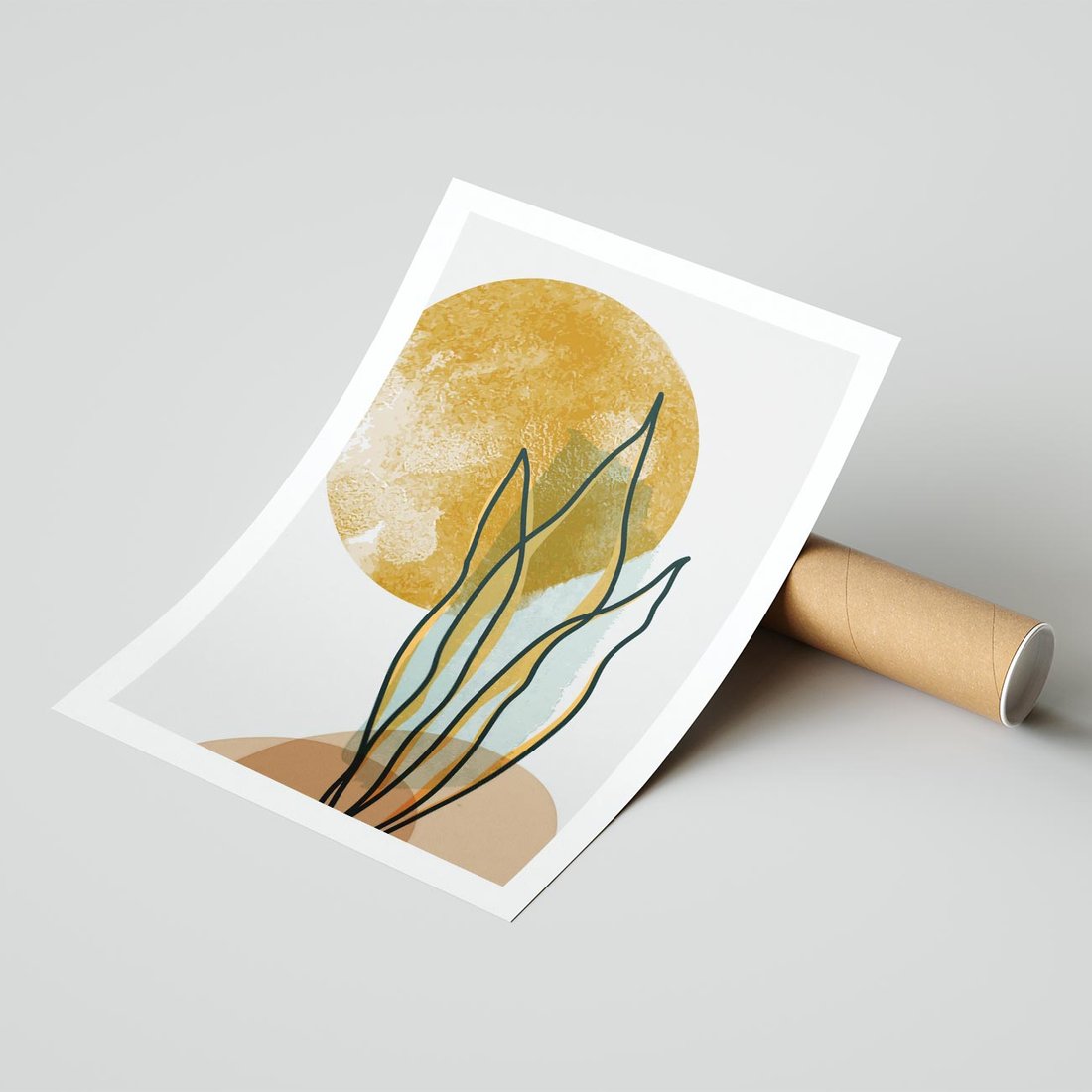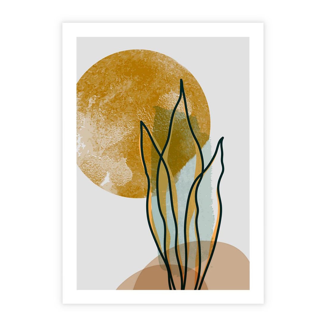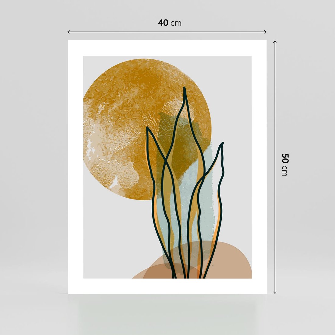 - Plakat bez ramy 40x50 - Światło Natury: Graficzne Liście i Złote Słońce