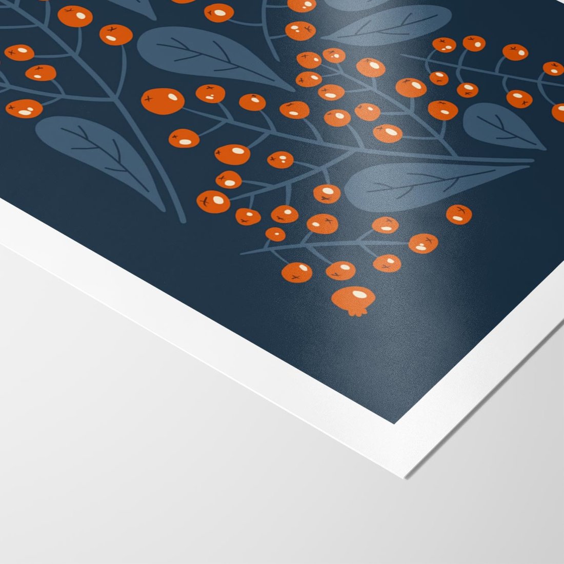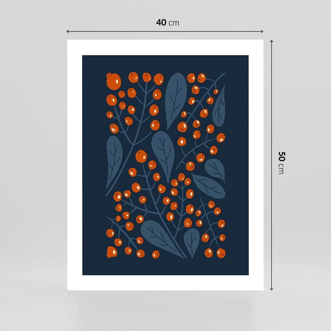 Plakat bez ramy 40x50 - Symfonia liści i owoców - granatowe tło, pomarańczowe owoce jarzębiny