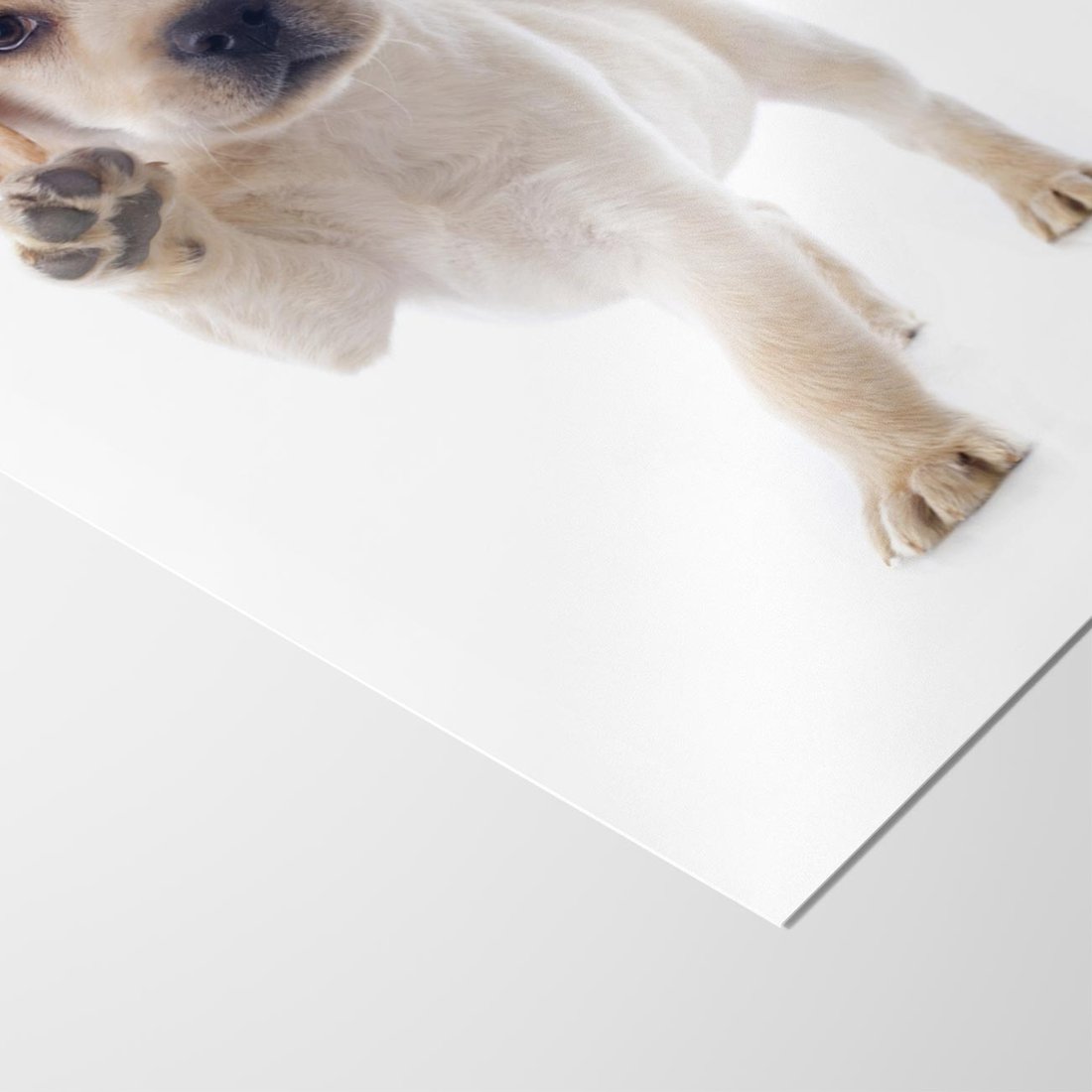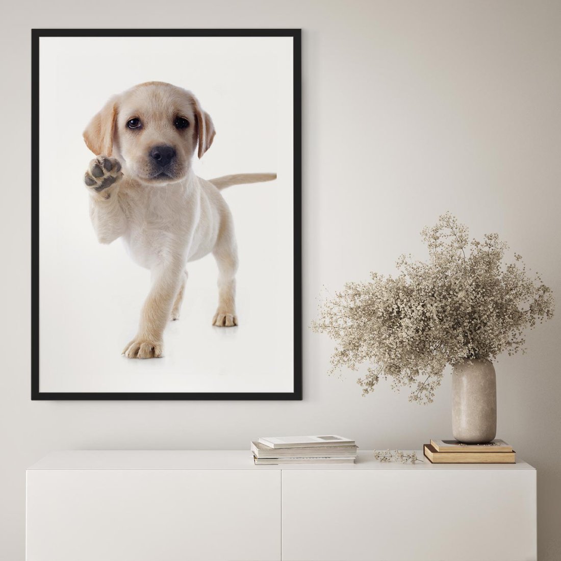 Ożyw swoje wnętrze tym uroczym obrazem przedstawiającym uroczego szczeniaka pełnego radości. Ciepłe kolory, przyjazne spojrzenie i energetyczne wyrażenie tworzą pozytywną atmosferę. Ten obraz dodaje uroku i radości, idealny dla miłośników zwierząt i osób pragnących wnieść do swojego domu pozytywną energię.