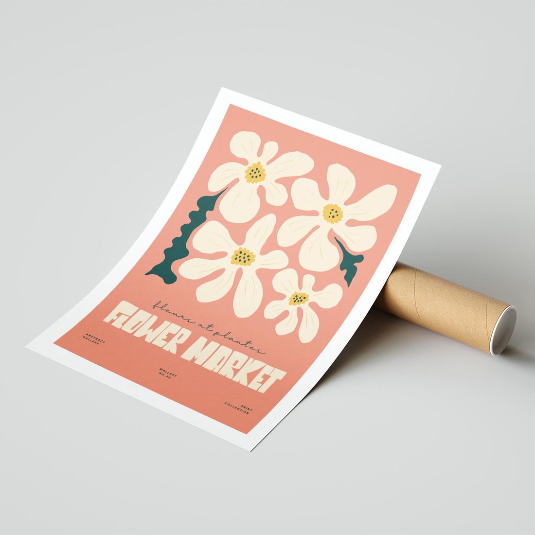 Ta kwiatowa kompozycja w minimalistycznym stylu prezentuje białe kwiaty na delikatnym różowym tle, z subtelnie umieszczoną typografią. To obraz, który doskonale łączy prostotę, piękno natury i estetykę typografii. Wprowadzi do wnętrza subtelny akcent kwiatowy, podkreślając równocześnie elegancję i spokój minimalistycznego designu.