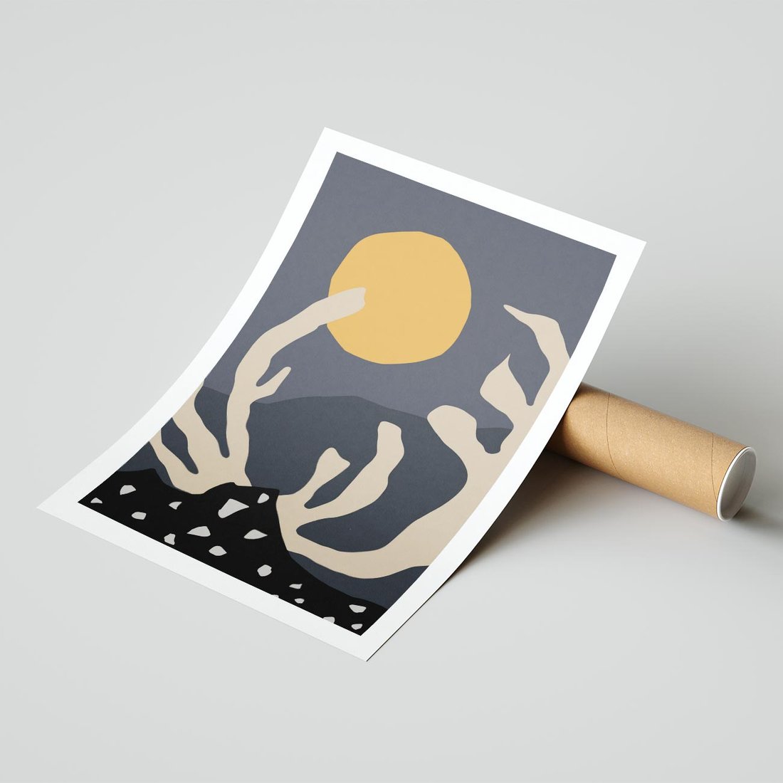 Ten nowoczesny plakat przedstawia piękną nocną scenerię z księżycem w pełni. To dzieło sztuki łączy w sobie elementy nowoczesnego designu z duchem boho, tworząc atmosferę tajemniczości i spokoju. Idealny wybór dla miłośników nocnych pejzaży i magii księżycowej.