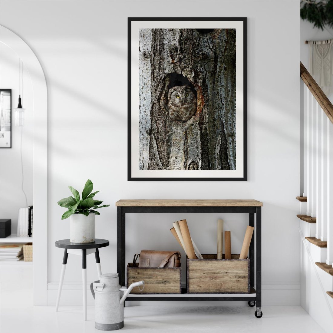 Przenieś się do świata nocy, gdzie sowa w swojej dziupli czuwa nad tajemniczym lasem. Ten ujmujący obraz na płótnie ukazuje sielski krajobraz i daje poczucie spokoju. Pozwól tej mądrej sowie wprowadzić harmonię i spokój do Twojego wnętrza.