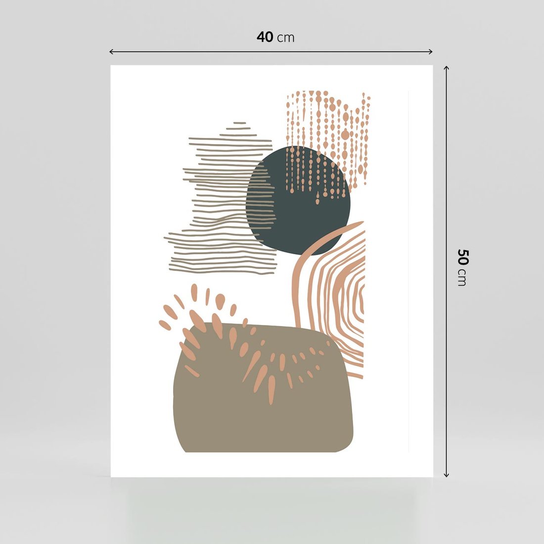 Ta abstrakcyjna kompozycja składa się z delikatnych kropek, kresek i kółek w spokojnych odcieniach brązu i beżu. Jej minimalistyczny charakter przynosi uczucie harmonii i spokoju, doskonale pasując do każdego wnętrza.