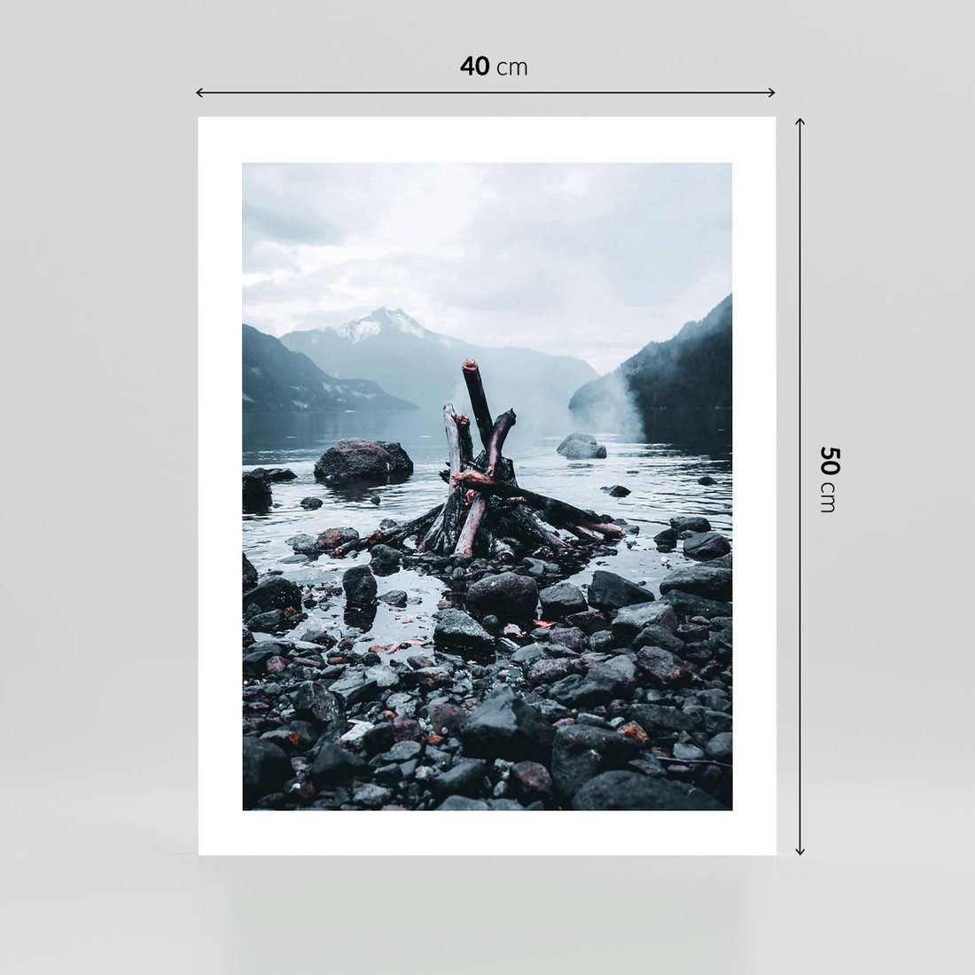 Plakat bez ramy 40x50 - To ujęcie jeziora w górach z zgaszonym ogniskiem nad brzegiem, tworząc atmosferę spokoju i refleksji w otoczeniu przyrody. - jezioro w górach, zgaszone ognisko