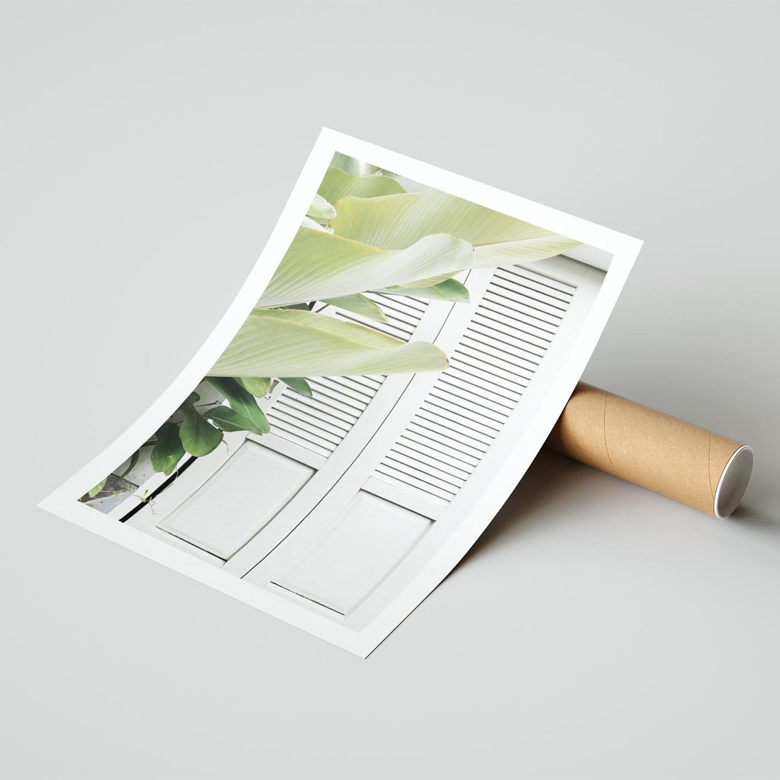Obraz przedstawia zieloną tropikalną roślinę, która pięknie kontrastuje z białymi okiennicami. To zdjęcie emanuje świeżością i przywołuje atmosferę tropikalnego ogrodu. Doskonale pasuje do wnętrz inspirowanych stylem botanicznym lub przytulnym wnętrzom pełnym roślin.