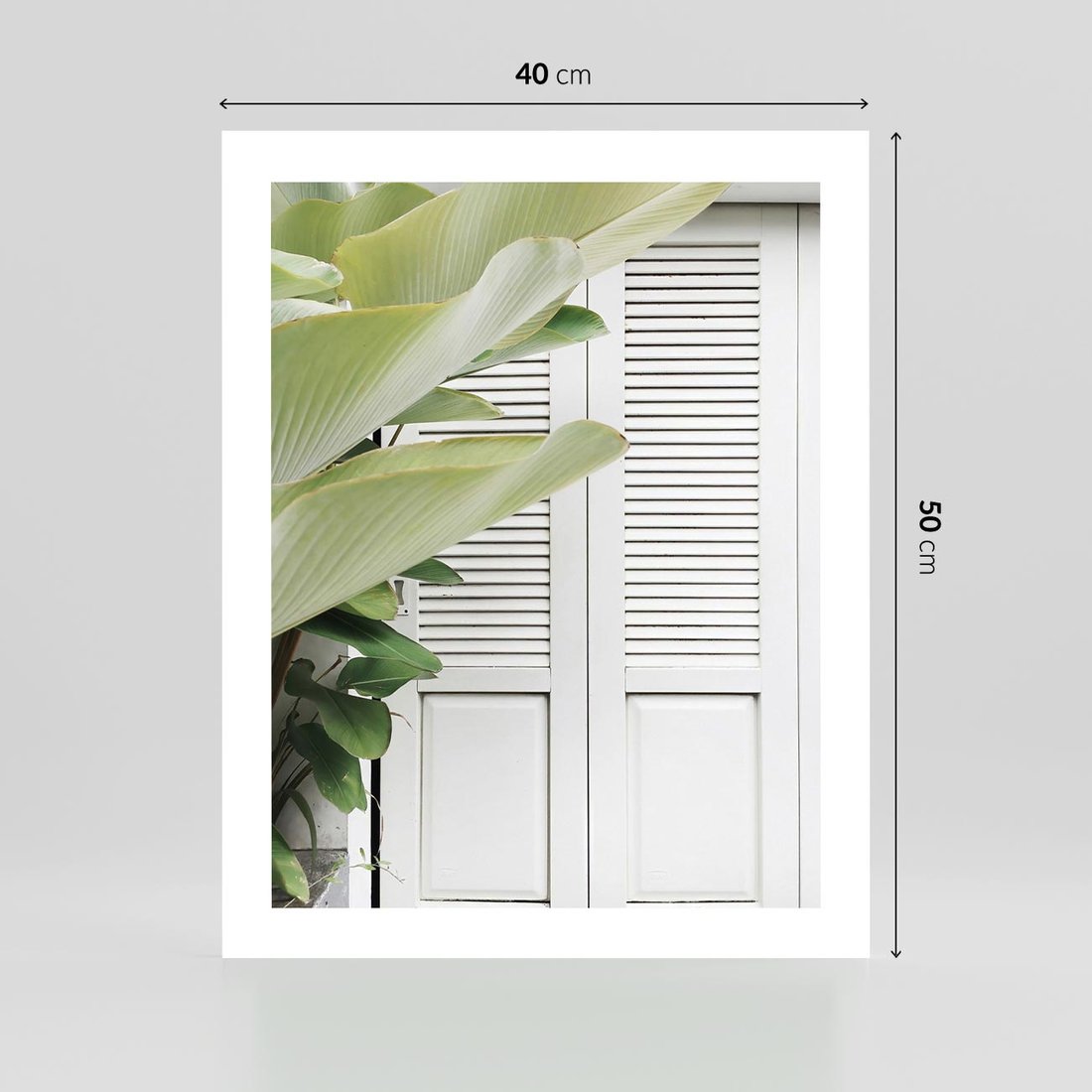 Plakat bez ramy 40x50 - Tropikalne Okno - białe okiennice, zielona tropikalna roślina