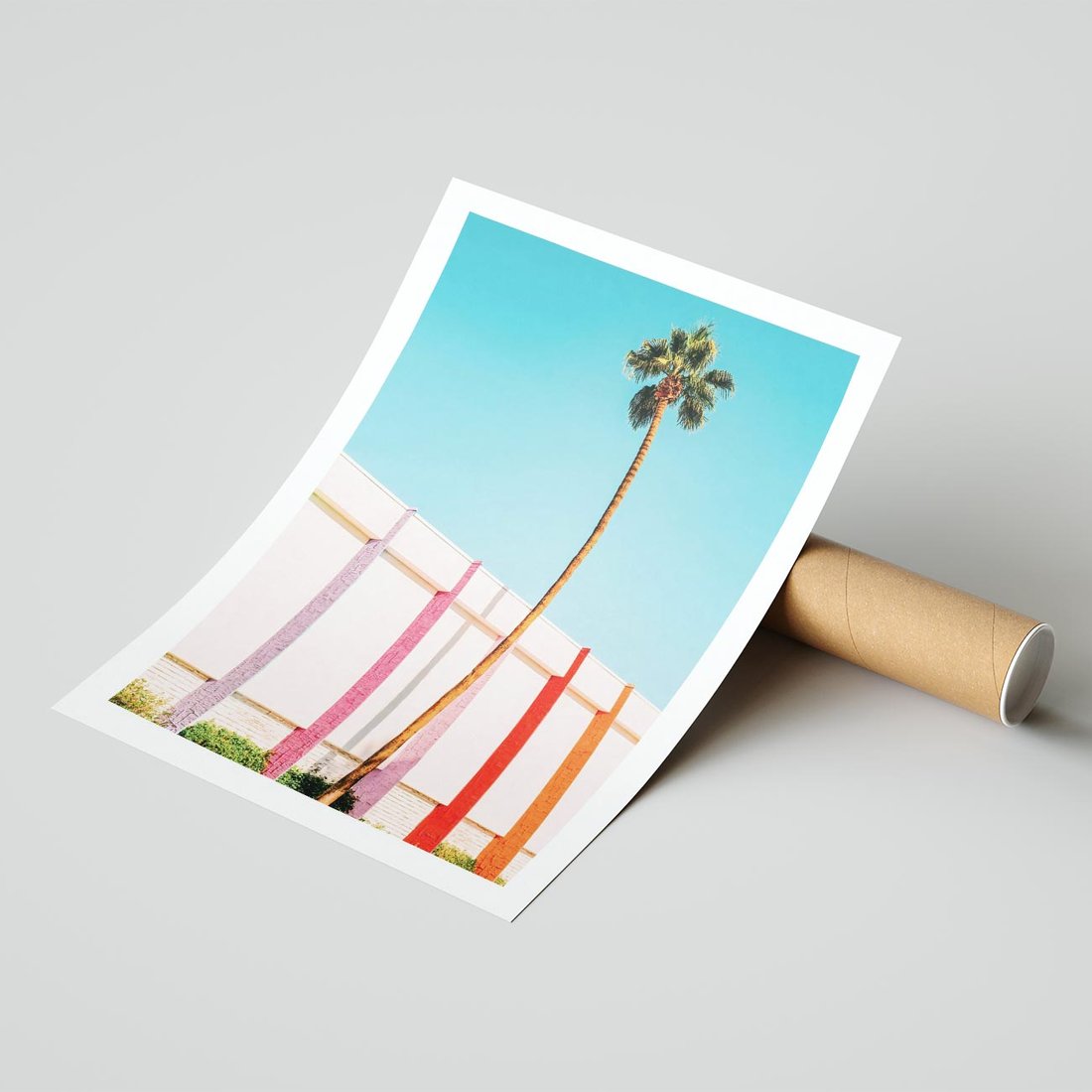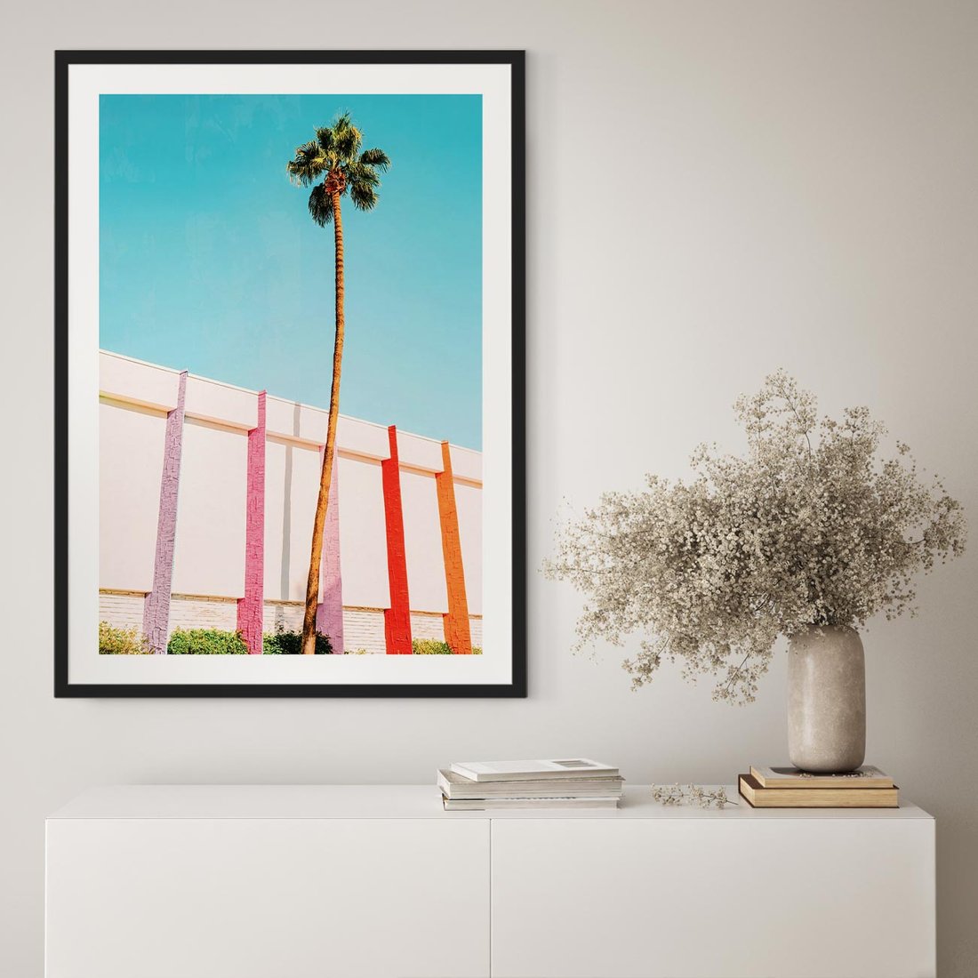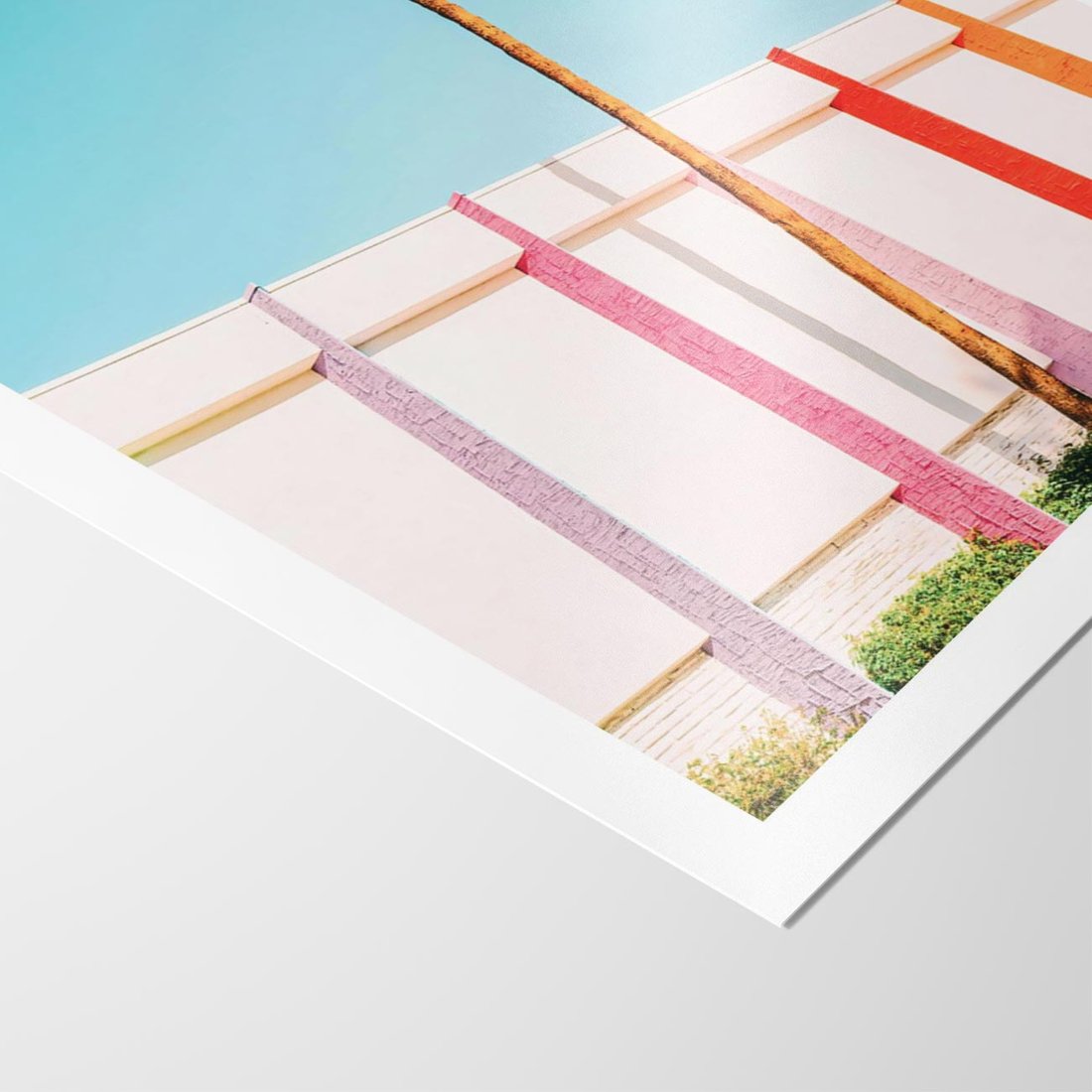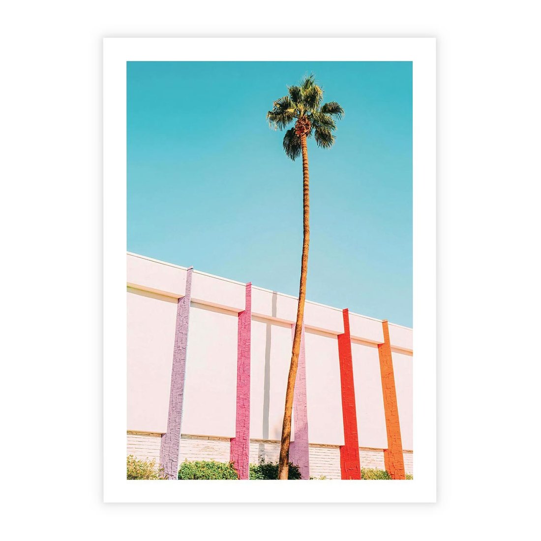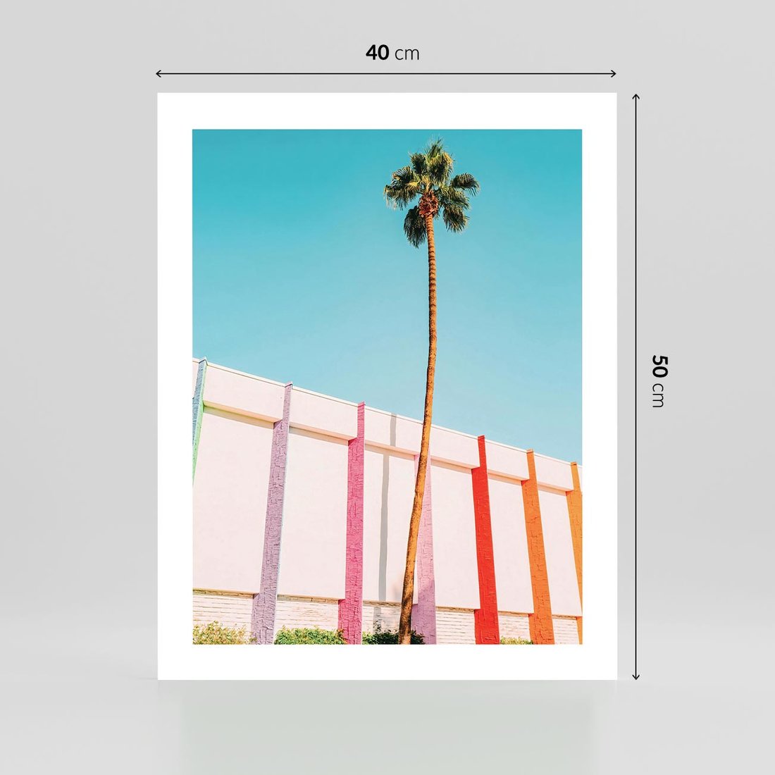 Obraz przedstawia palmę na tle błękitnego nieba oraz kolorowy mur o odcieniach pasteli. To harmonijne połączenie natury i architektury, które nadaje obrazowi radosny i tropikalny charakter.