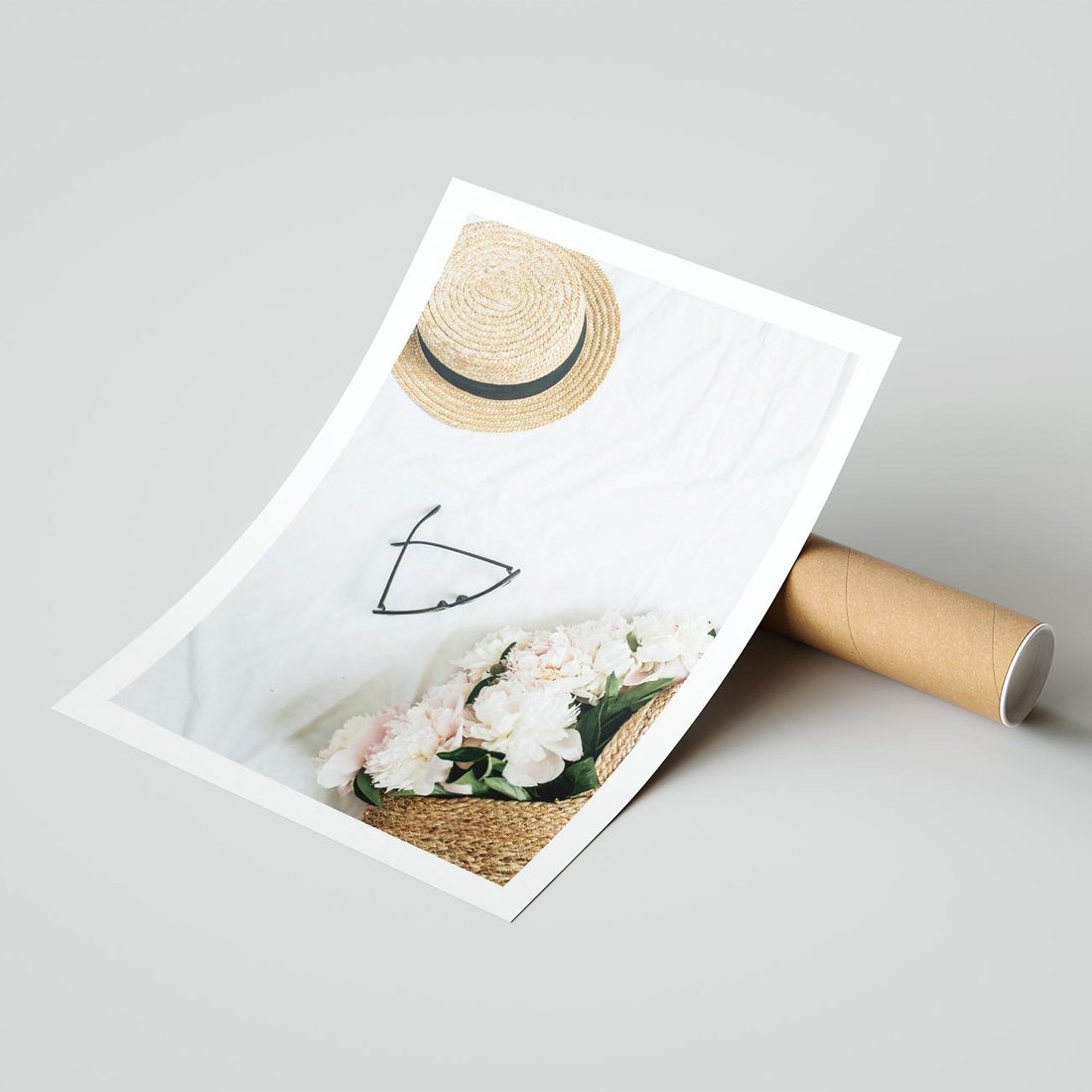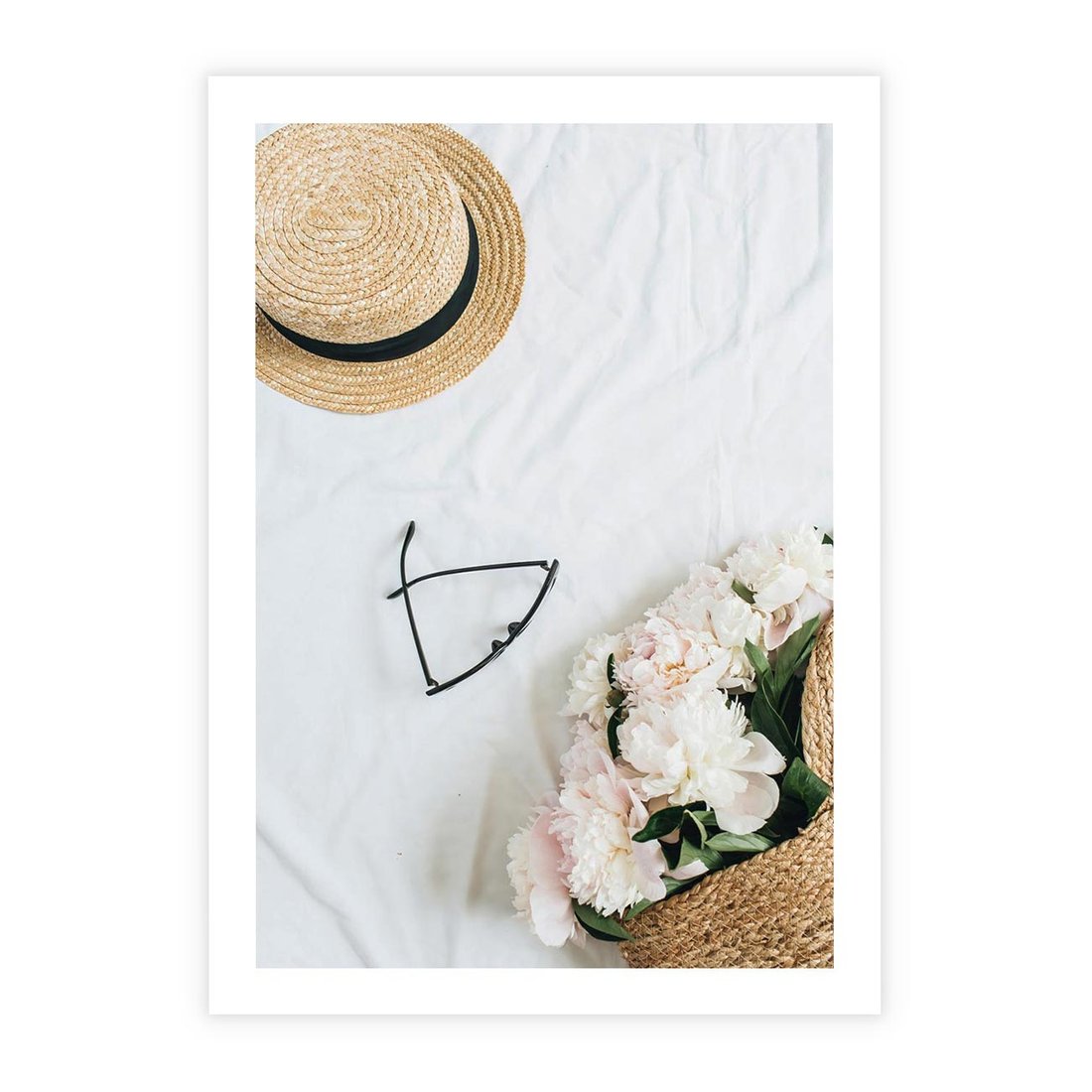 Obraz przedstawia kompozycję taką jak kapelusz, białe kwiaty i okulary. Ta kompozycja podkreśla subtelność i elegancję kobiecego stylu.