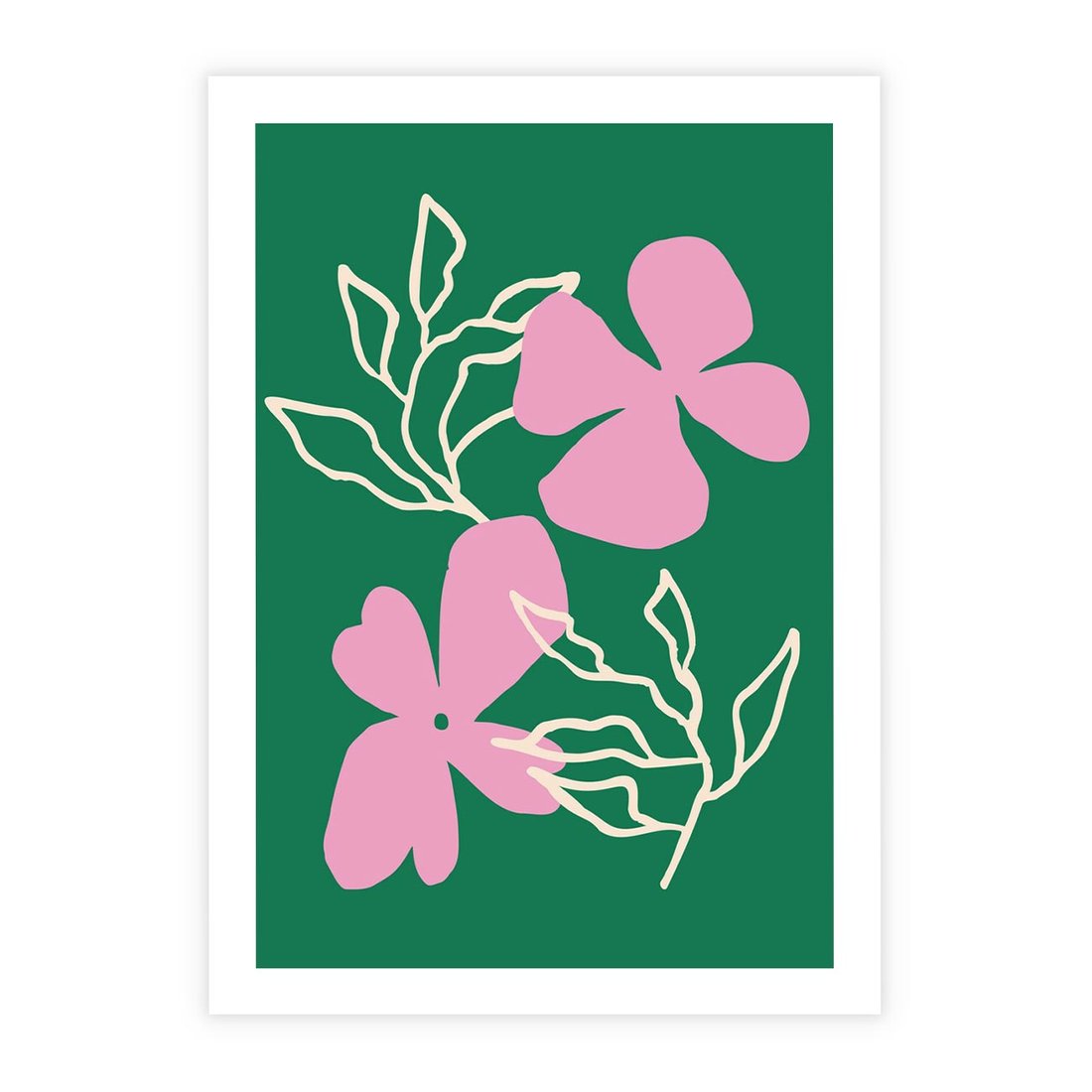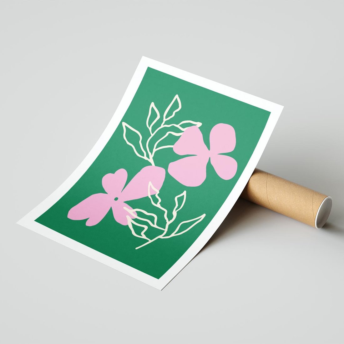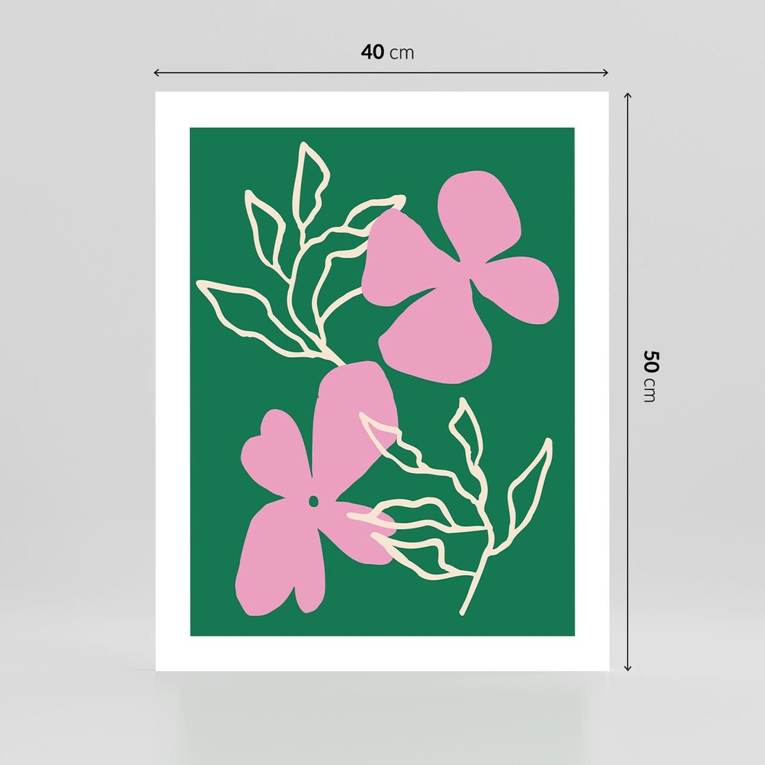 Ten abstrakcyjny plakat w boho stylu ukazuje intensywną zieleń i róż, z delikatnie wkomponowanymi kwiatowymi motywami. Idealnie pasuje do biura, dodając odrobinę natury i artystycznej energii, tworząc inspirujące otoczenie do pracy i twórczego myślenia.