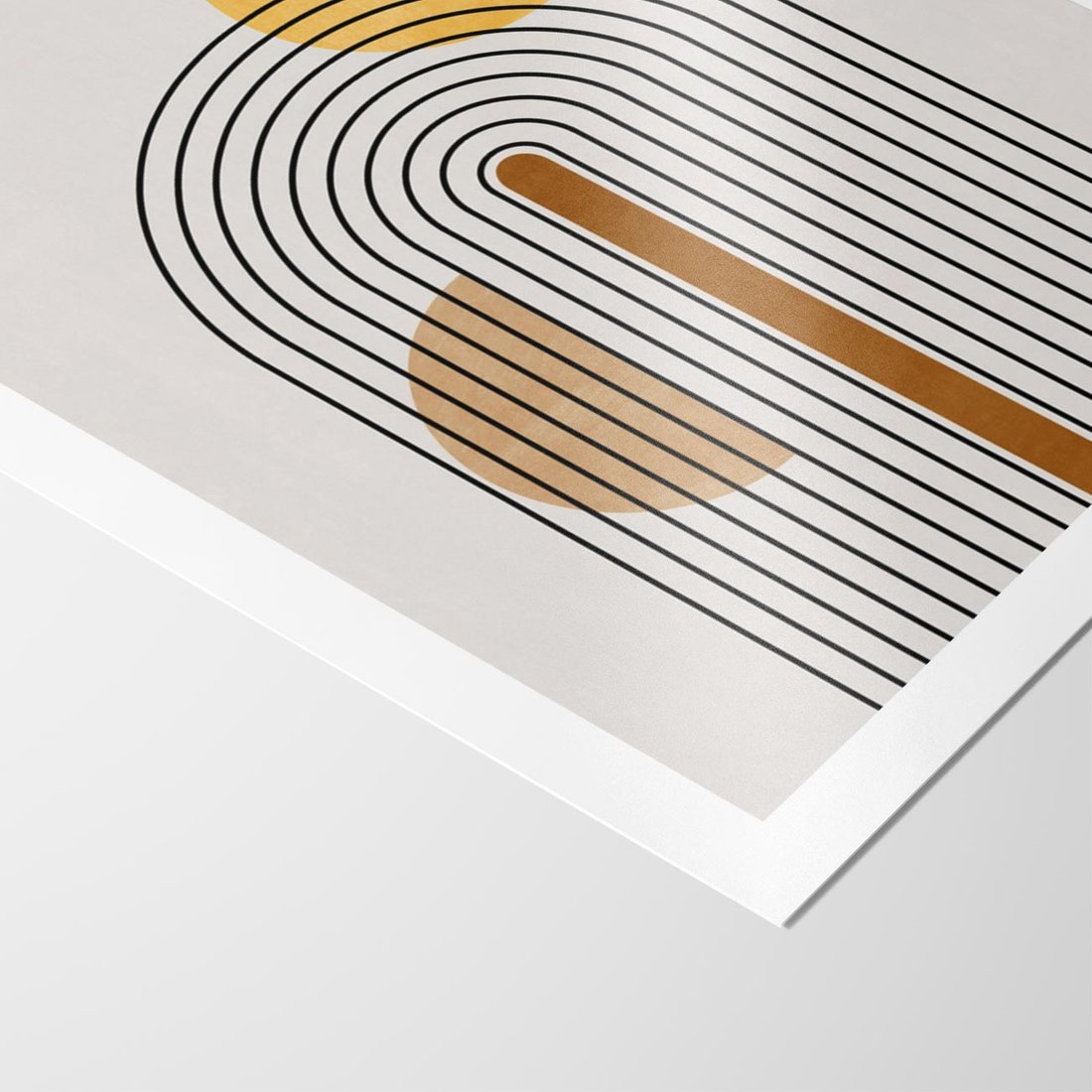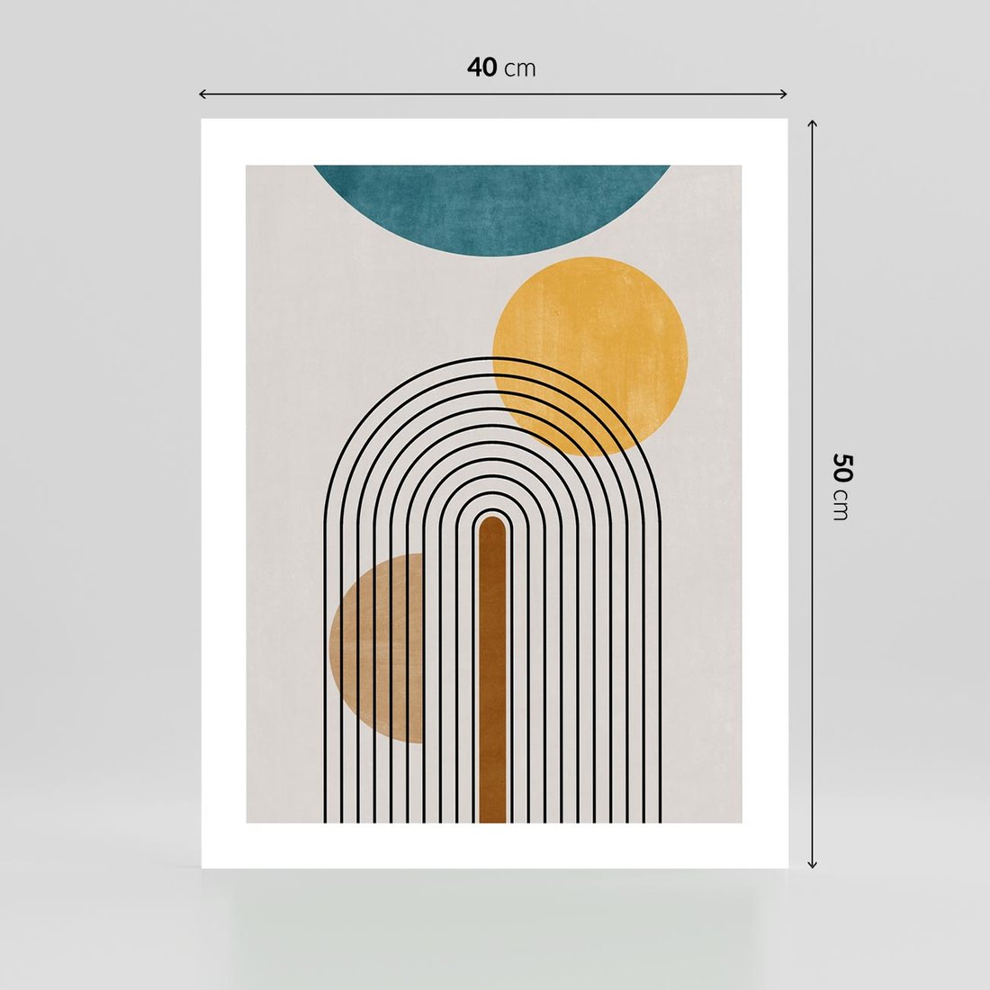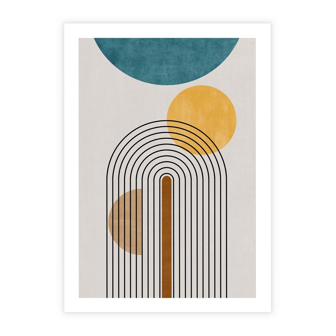 Ten plakat w stylu mid century łączy nowoczesną sztukę z regularnymi liniami i okręgami, tworząc harmonijną kompozycję, która idealnie pasuje do współczesnych wnętrz.
