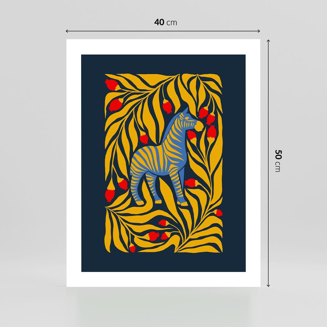 Ta nowoczesna sztuka przedstawia zebrę na granatowym tle, w otoczeniu żółtych roślin. Kompozycja tworzy wyjątkowy kontrast między zwierzęciem a roślinami, zachęcając do odkrywania piękna natury w nowatorski sposób.