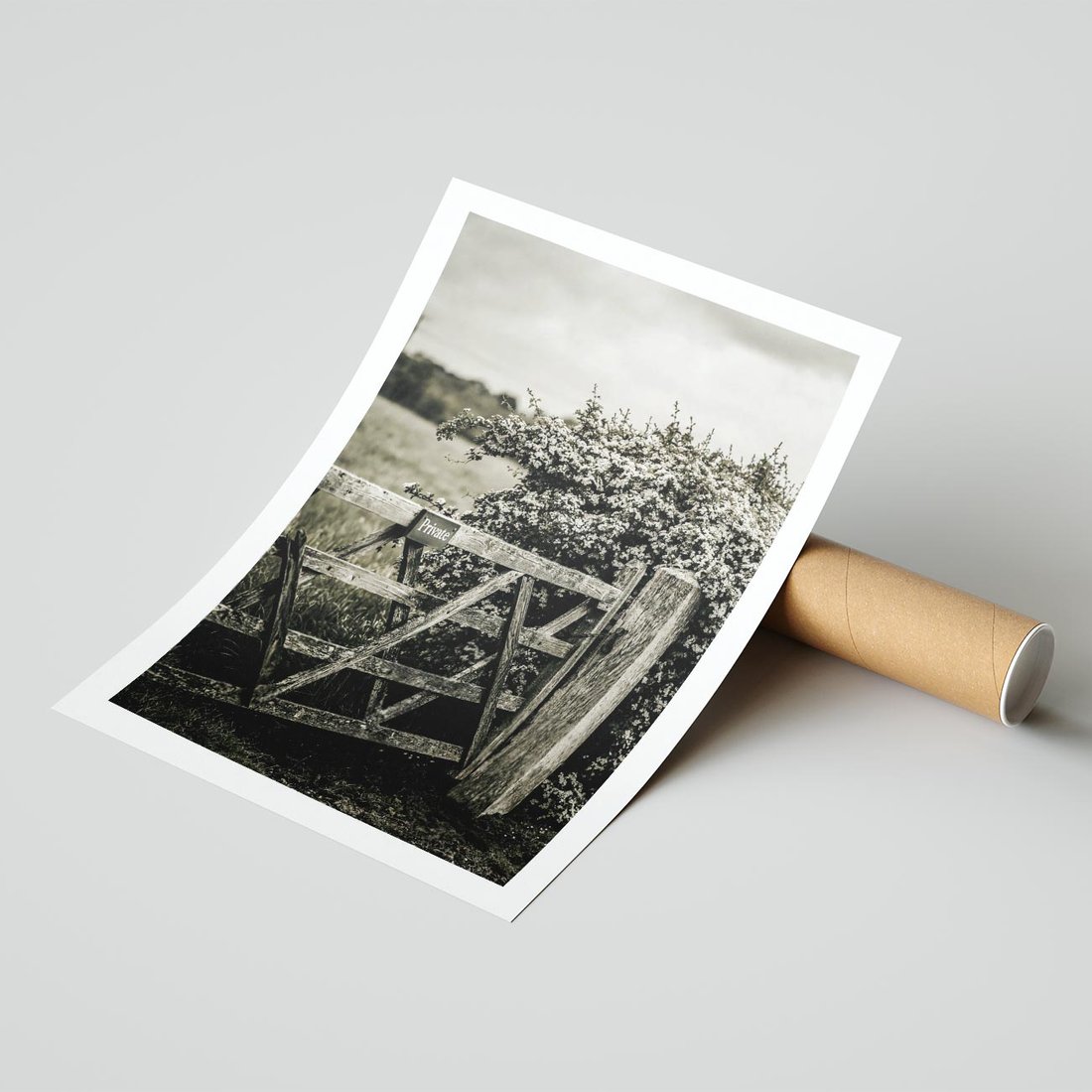 Plakat bez ramy 40x50 - Wiejski Urok: Stary Płot i Kwitnący Krzew - rustykalne zdjęcie, stary płot