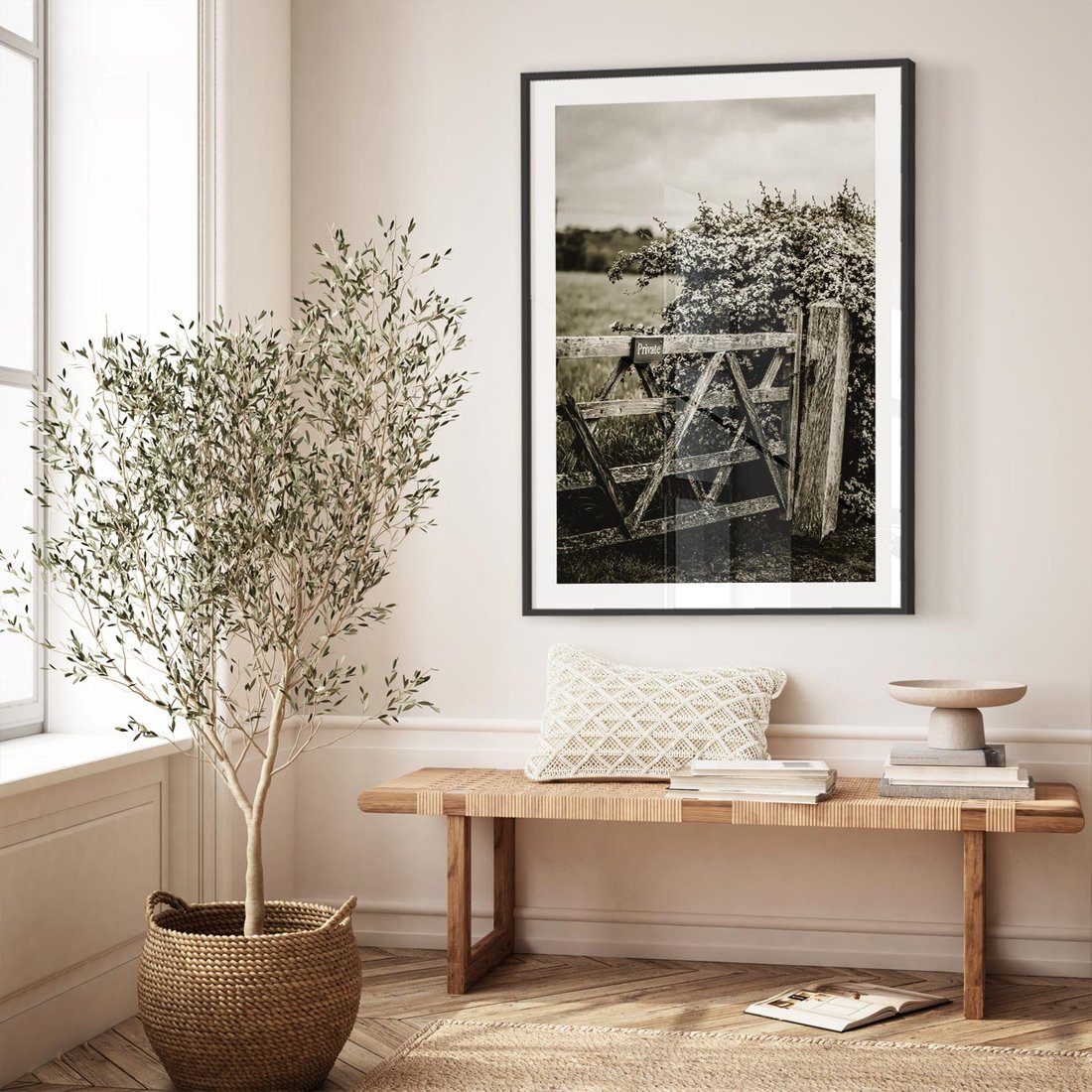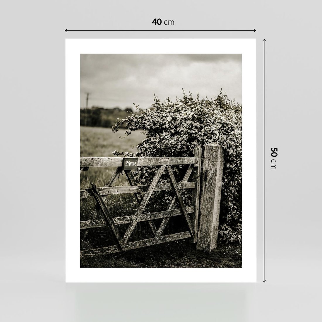 - Plakat bez ramy 40x50 - Wiejski Urok: Stary Płot i Kwitnący Krzew
