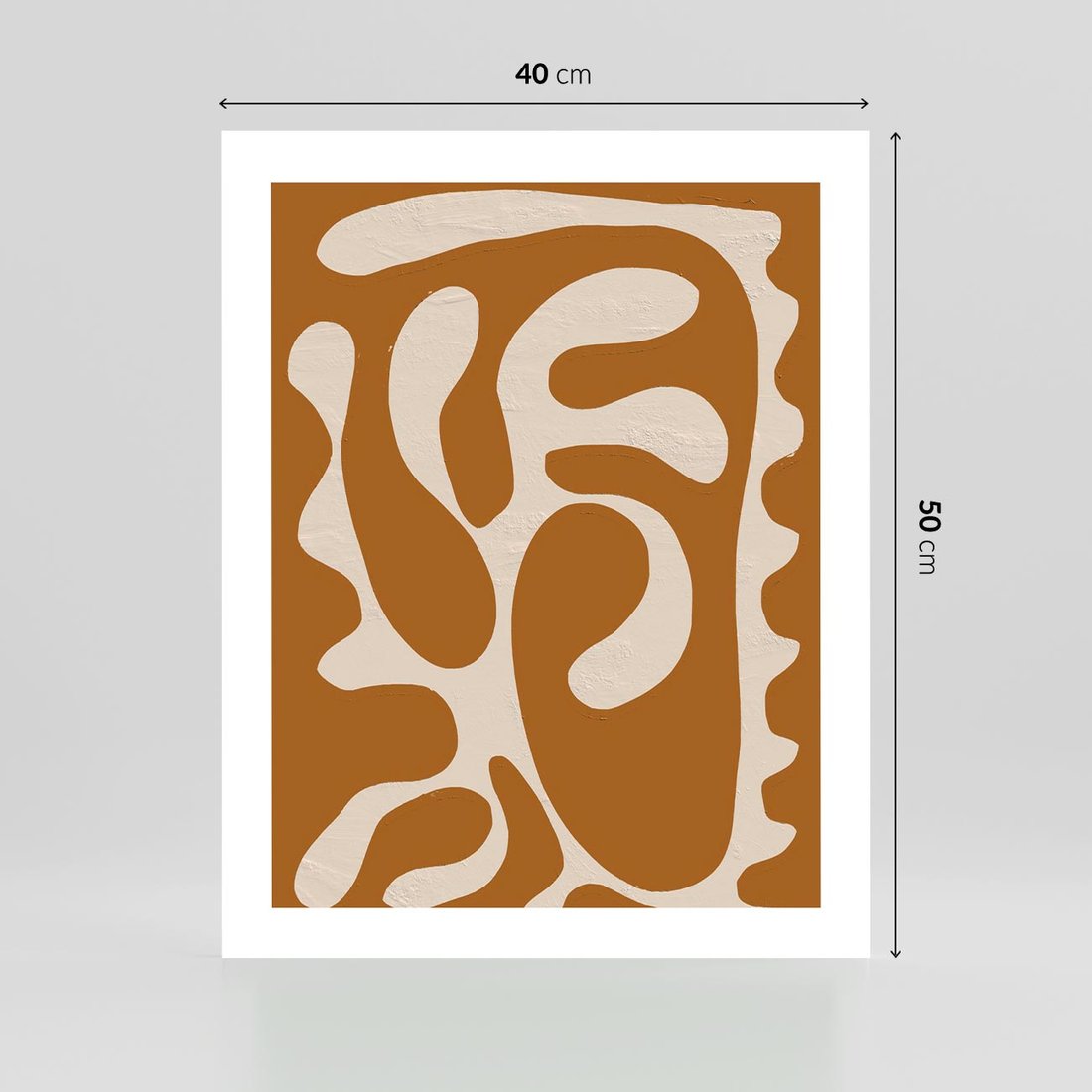 Ten abstrakcyjny obraz w formie plakatu prezentuje fascynujące i dziwne kształty, które kontrastują z ciepłym brązowym tłem. Kompozycja ta tworzy unikalną wizję sztuki abstrakcyjnej, pobudzając wyobraźnię i zachęcając do interpretacji.