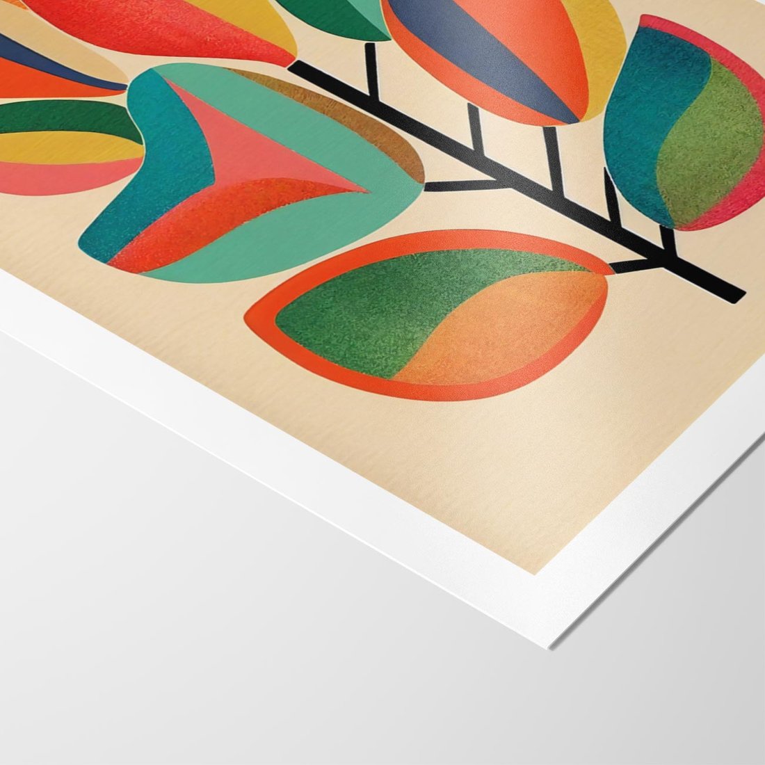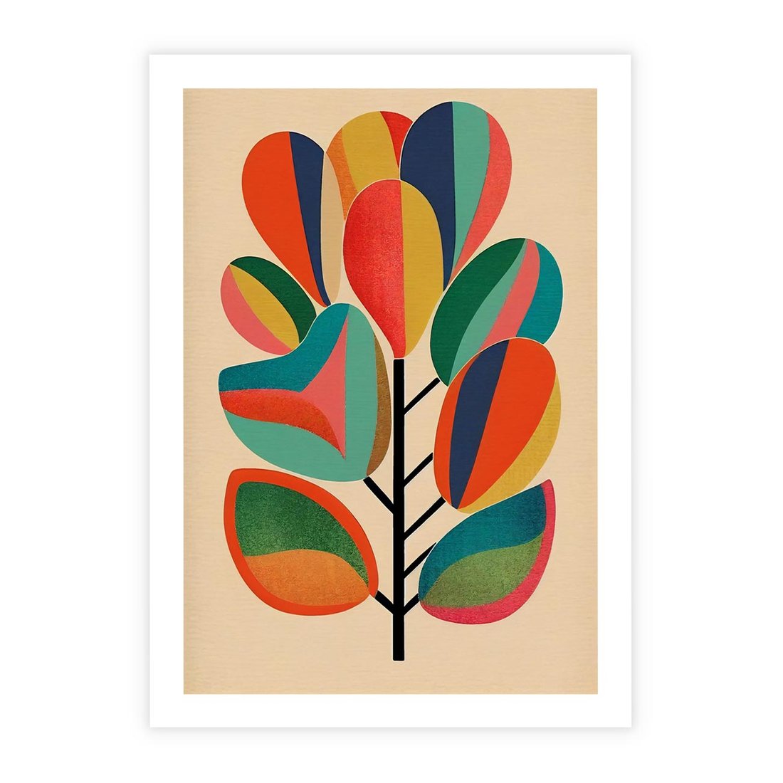 Ten abstrakcyjny obraz ożywa intensywnymi kolorami tęczy, tworząc dynamiczną kompozycję z inspiracją w świecie roślin. Splot różnorodnych form i barw przywołuje naturę w pełnym blasku, dodając wyjątkowego uroku każdemu wnętrzu.