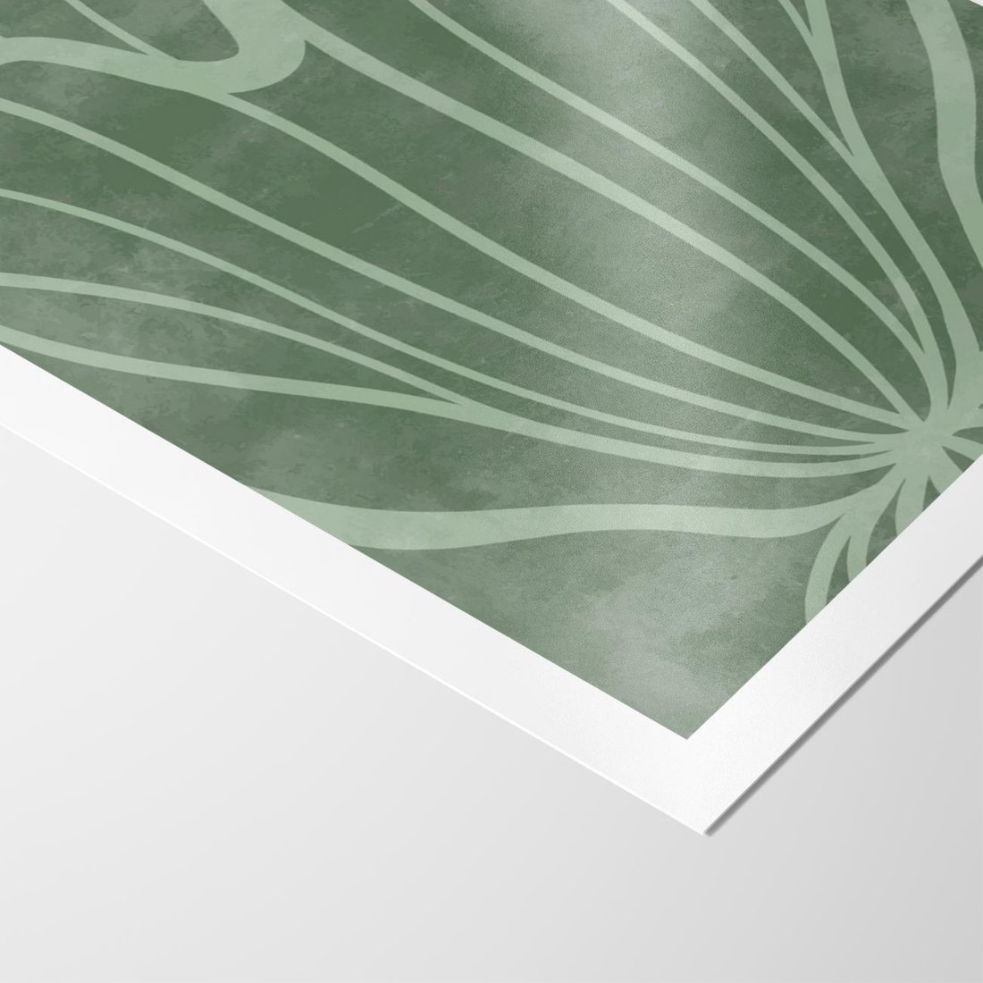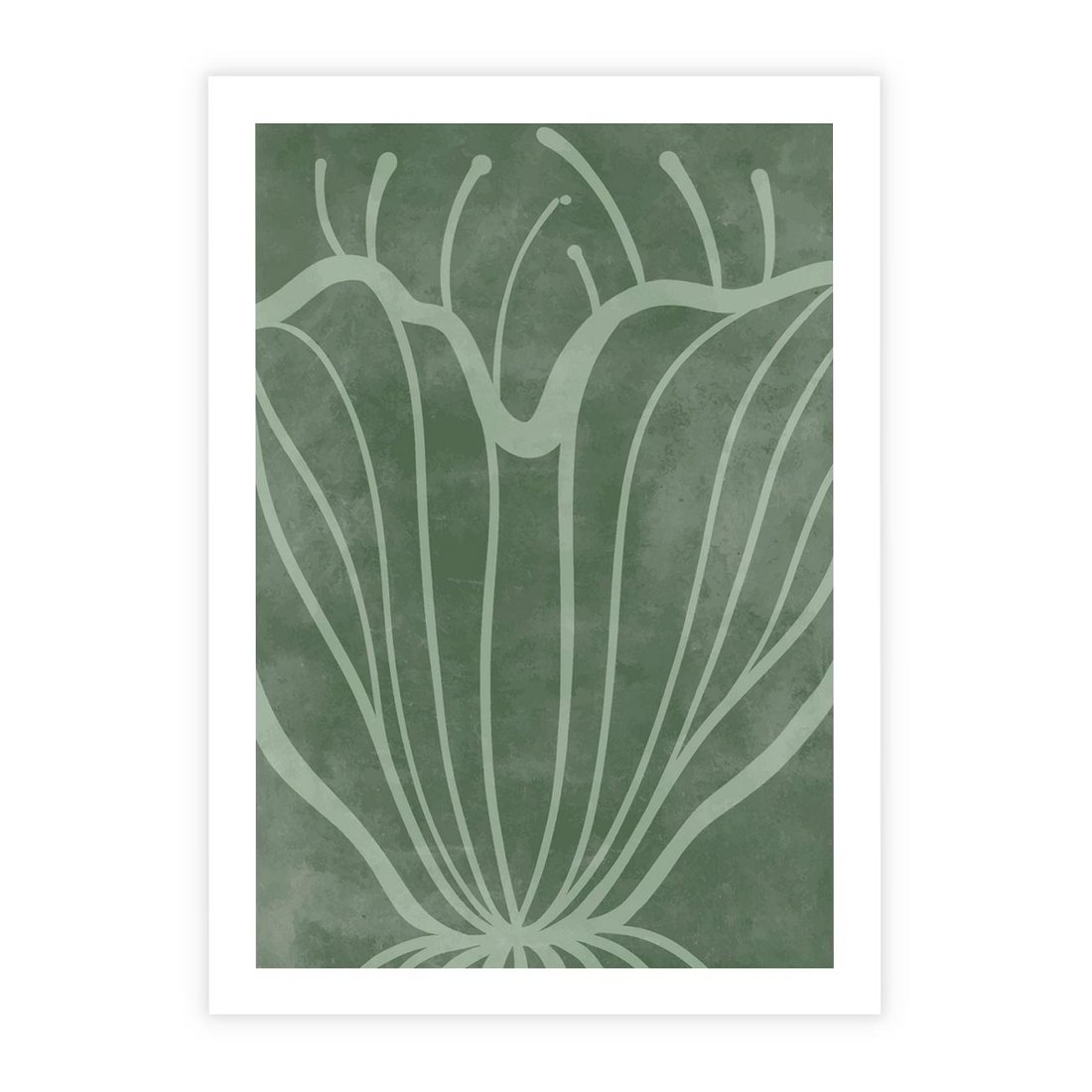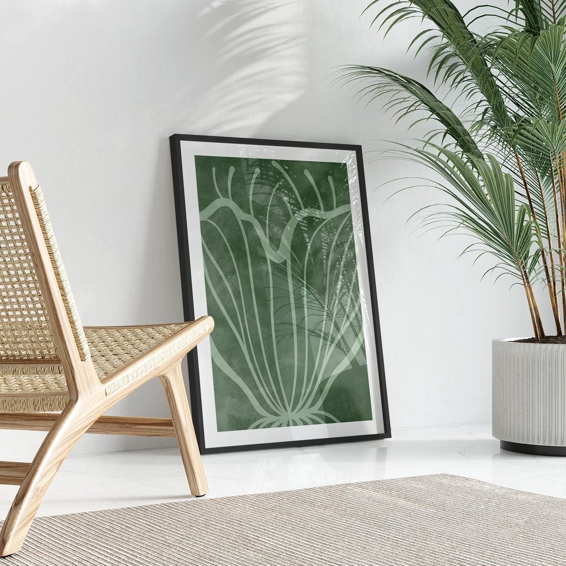 Ożywiający zielony plakat, zainspirowany roślinami, doskonale wpisuje się w minimalistyczne i nowoczesne wnętrza. Jego subtelne wzory dodają przyjemnej atmosfery.
