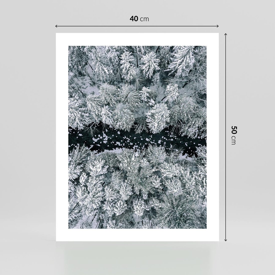 Plakat bez ramy 40x50 - Zimowy Krajobraz z Góry - zdjęcie z góry, zaśnieżony las i zamarznięty strumyk