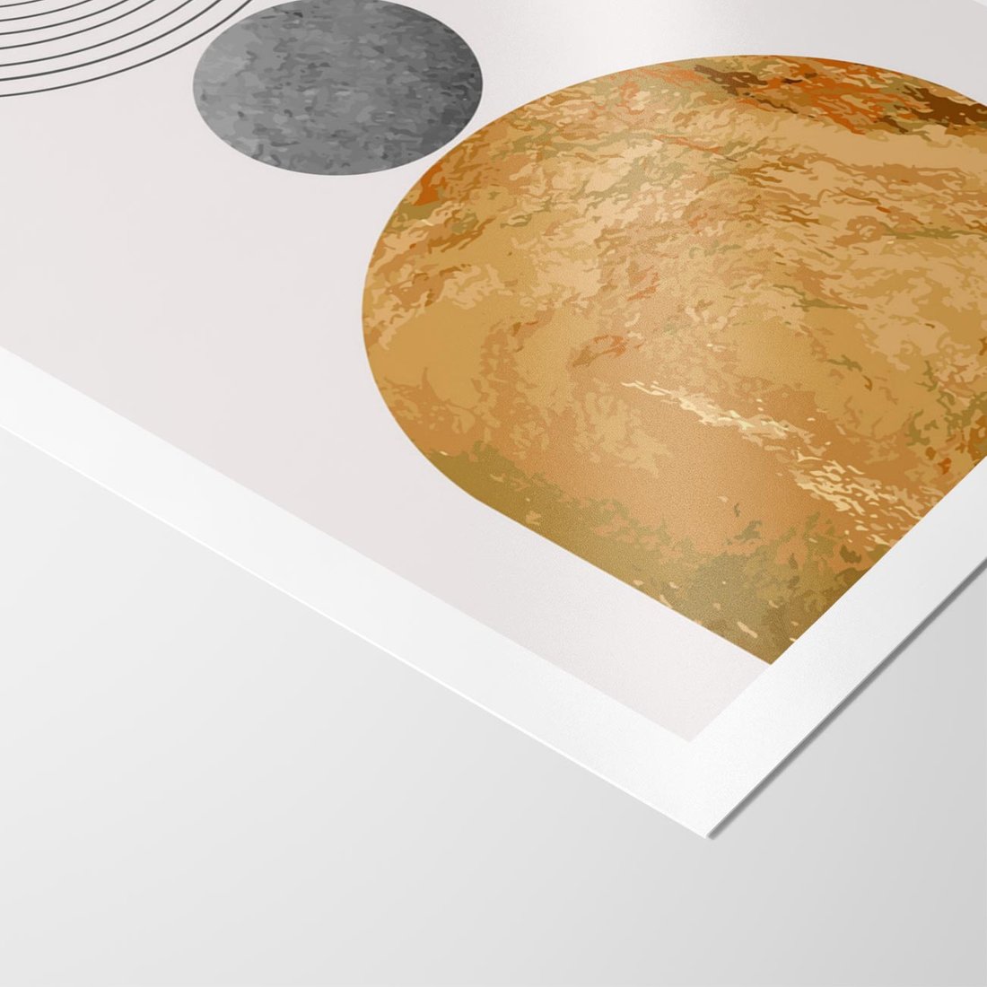 Nasza grafika to hołd dla estetyki i prostoty. To minimalistyczne dzieło sztuki przedstawia złote półkole w środku geometrycznego wzoru, co tworzy wyjątkową i nowoczesną kompozycję. Ta dekoracja jest idealnym dodatkiem do nowoczesnych wnętrz, dodając im elegancji i unikalnego stylu.