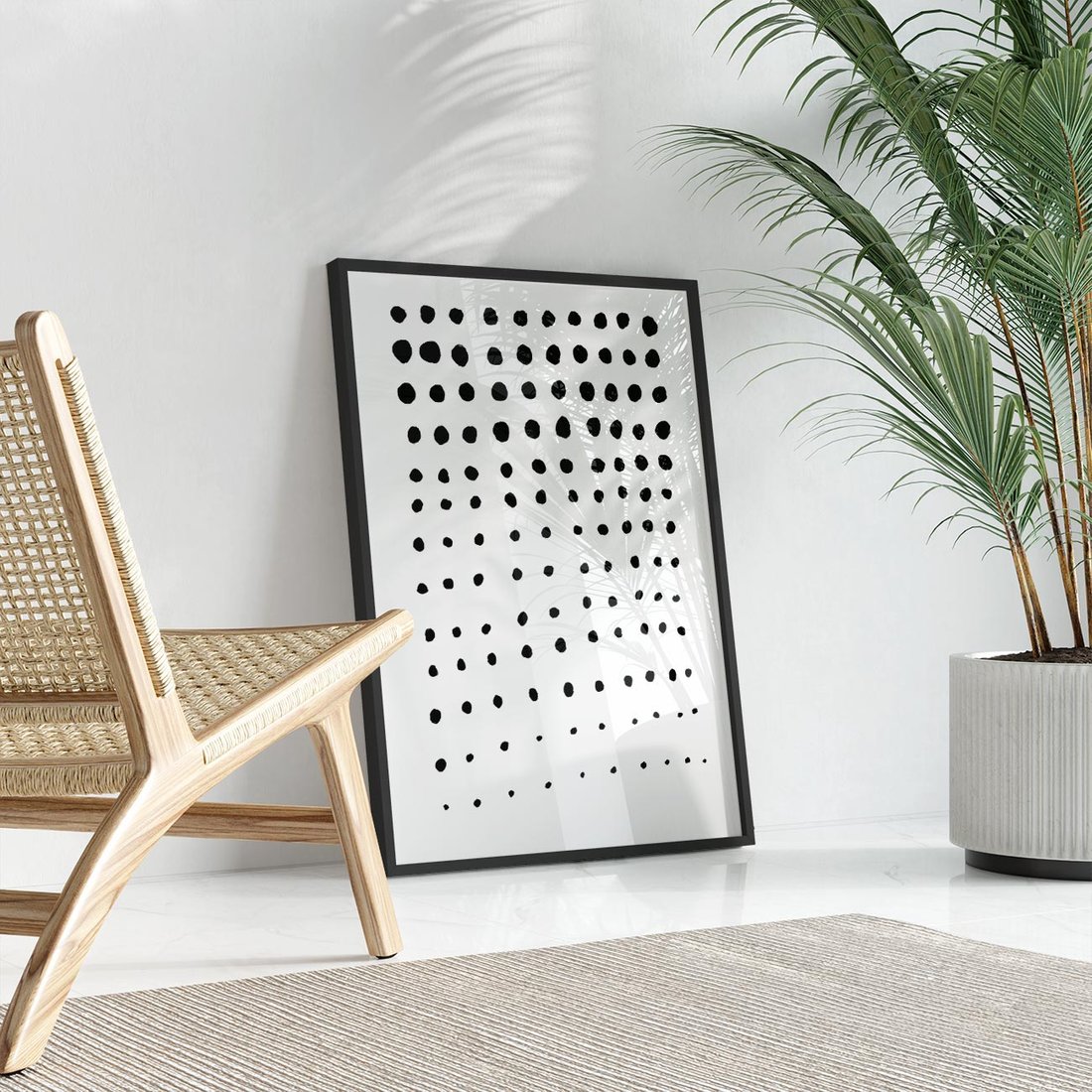 Nasz minimalistyczny czarno-biały plakat to abstrakcyjna kompozycja z czarnych kropek. To połączenie prostoty i wyrazistości tworzy hipnotyzujący wzór, idealny dla miłośników minimalizmu z zamiłowaniem do abstrakcji.