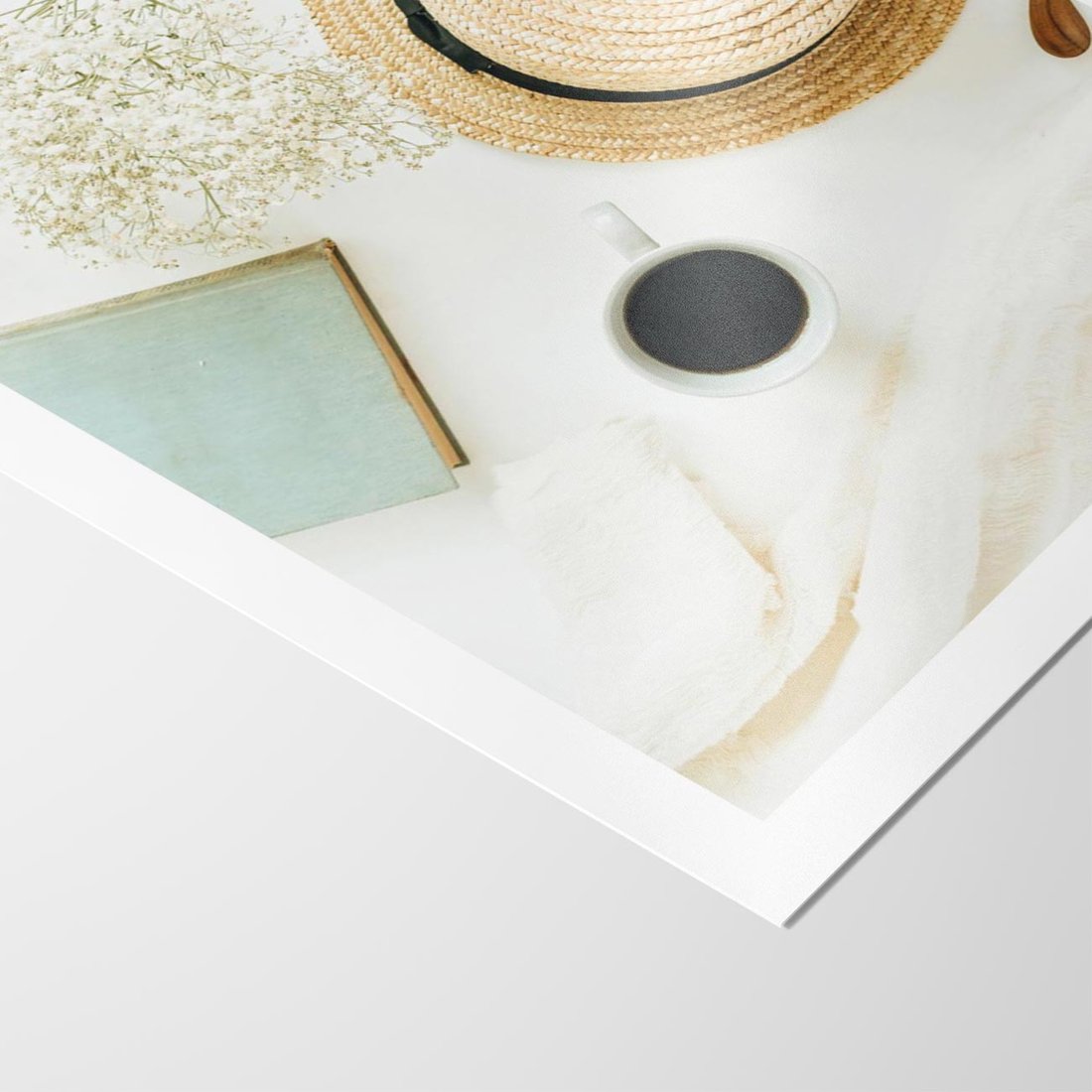 W tej boho kompozycji, delikatny słomkowy kapelusz, kolorowe kwiaty i filiżanka gorącej kawy tworzą harmonijną całość, emanując ciepłem i stylem.