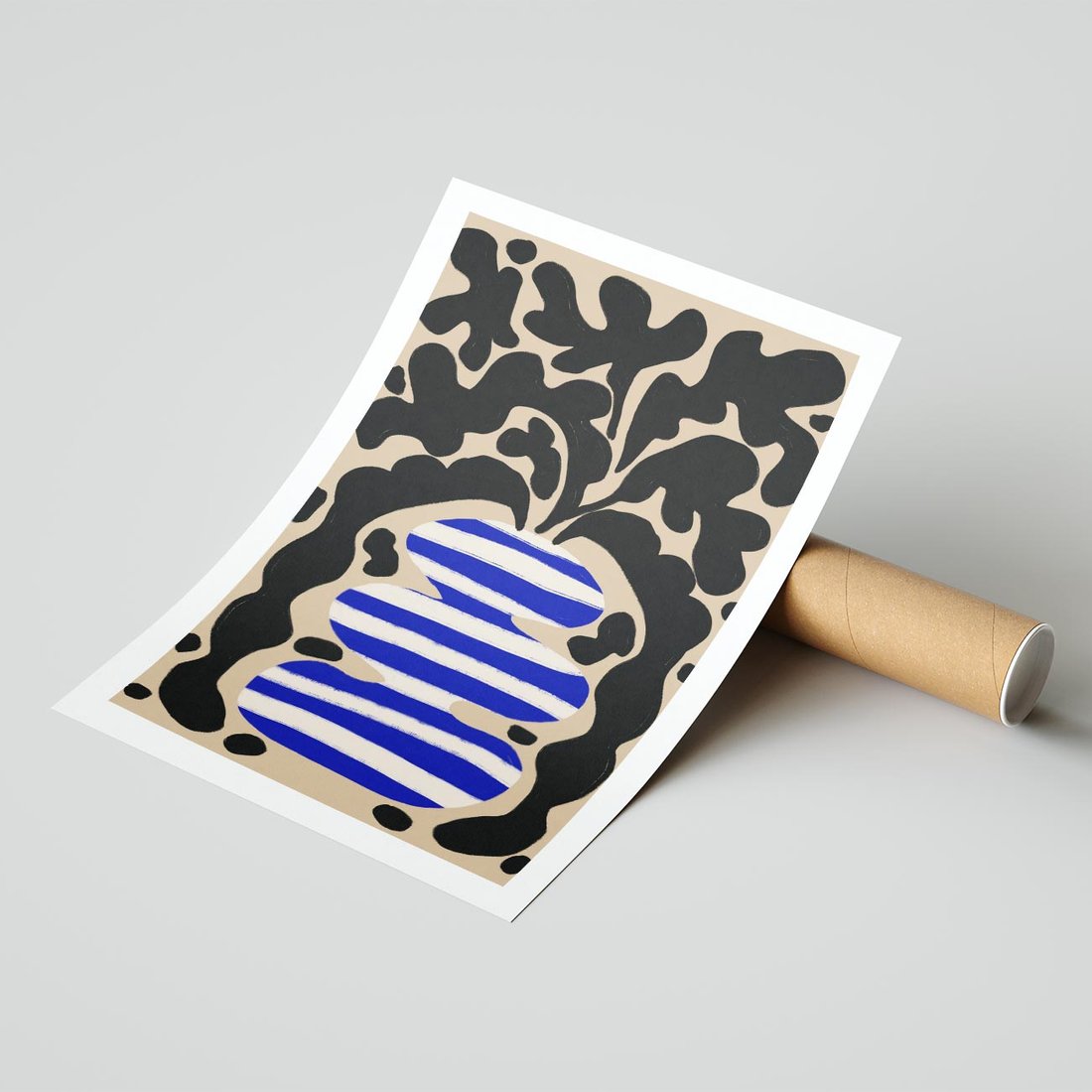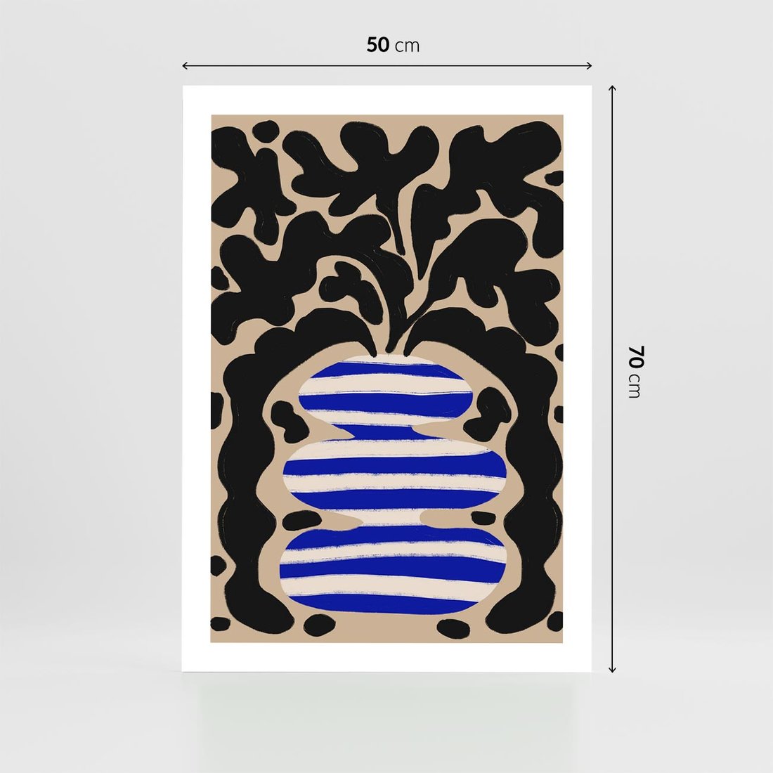 Ten abstrakcyjny plakat prezentuje fascynujące formy, które mogą przypominać wazon w biało-niebieskie pasy, a w nim umieszczone są stylizowane, czarne liście. To wyjątkowy dodatek do każdego wnętrza.
